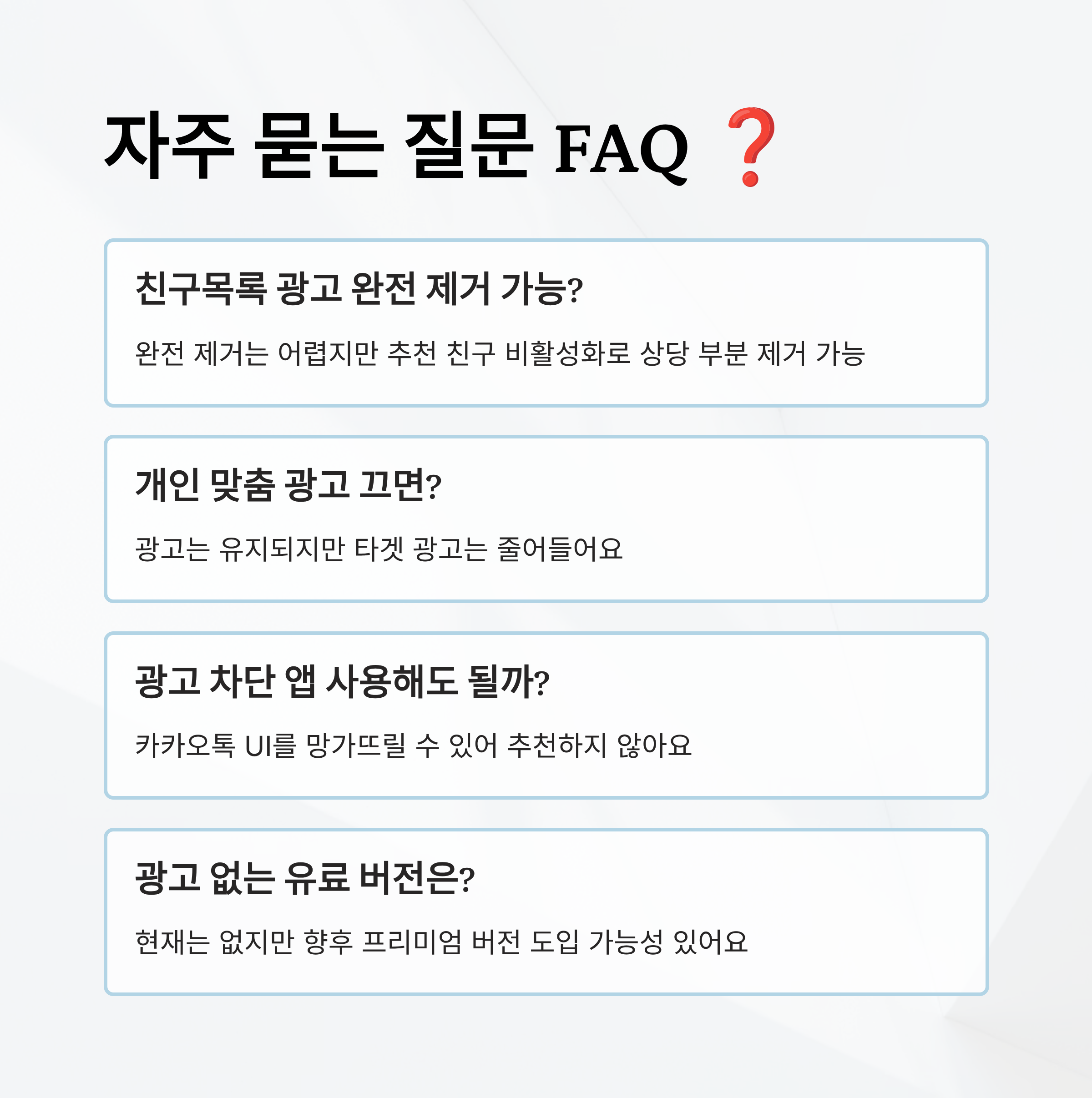A6. 일부 광고 차단 앱은 카카오톡 UI를 망가뜨릴 수 있으니 추천하지 않아요.