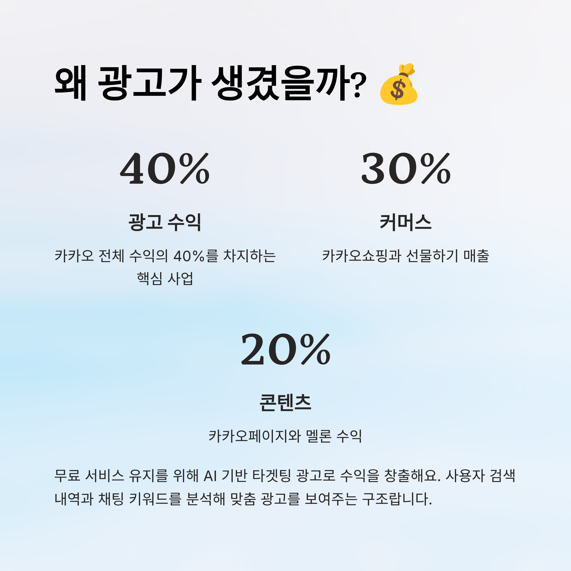 2025년 기준으로 카카오의 수익 구조를 보면 광고와 커머스, 콘텐츠가 큰 비중을 차지해요. 그중 '카카오 비즈보드'라는 플랫폼을 통해 사용자 타겟팅 광고를 적극적으로 보여주는 방식이 사용되고 있답니다. 사용자 검색 내역, 소비 성향, 채팅 키워드까지 AI가 분석해서 관련 광고가 뜨는 구조예요.