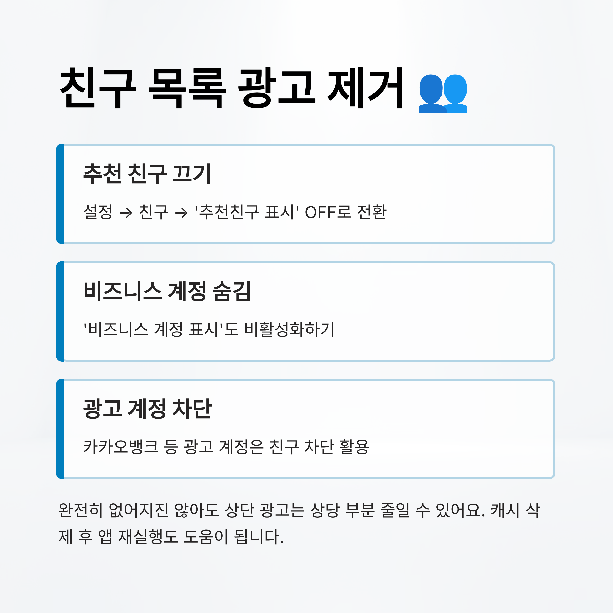 1️⃣ 카카오톡 → 더보기(≡) → 설정 → 친구 → '추천친구 표시' 끄기 2️⃣ '비즈니스 계정 표시'도 OFF로 전환 3️⃣ 이후에도 광고가 계속 보이면 캐시 데이터를 삭제하고 앱을 재실행해 보세요.