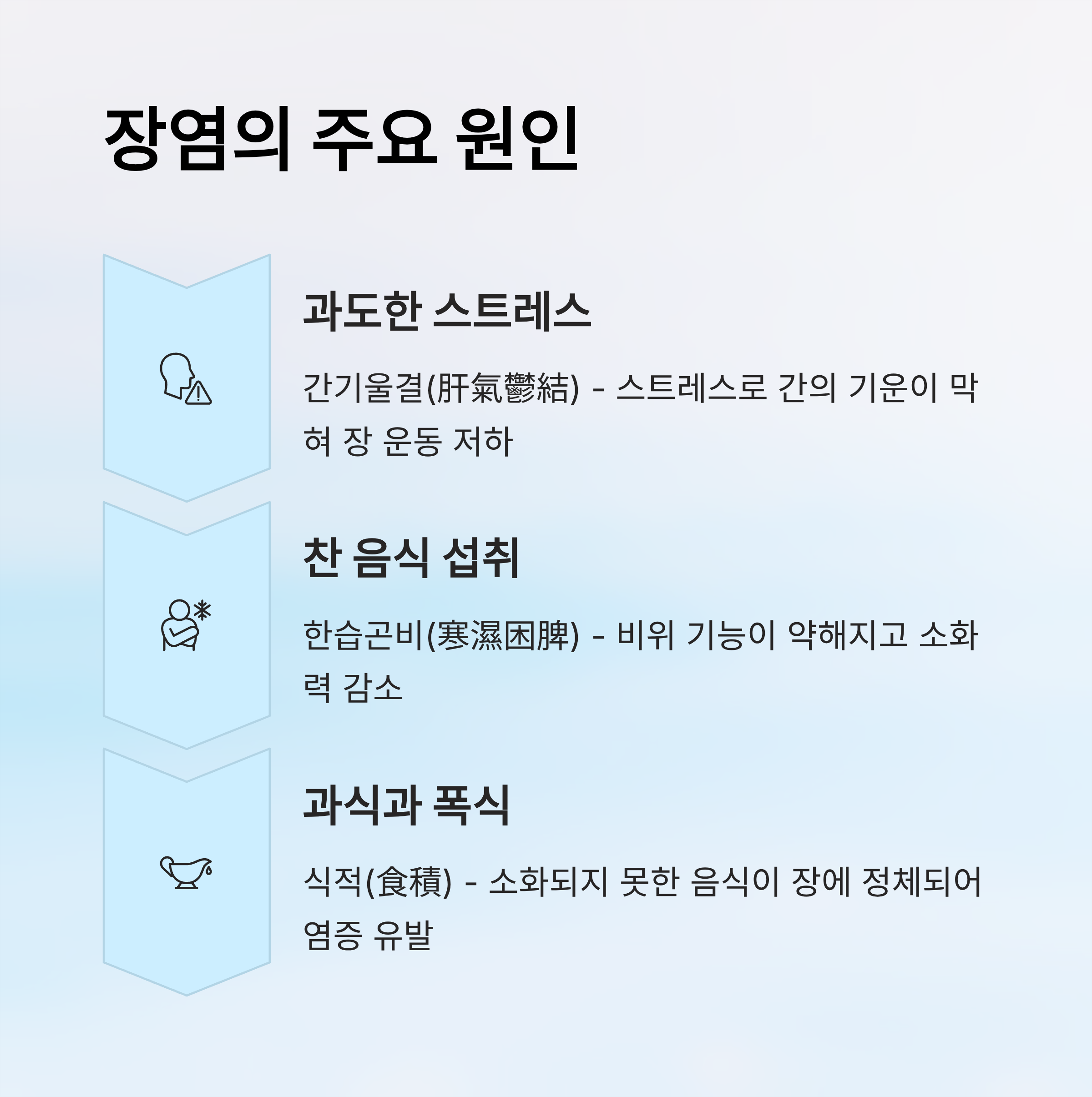 제가 생각했을 때, 이 부분이 서양의학과 한의학이 접근하는 방식의 가장 큰 차이 같아요. 서양의학은 장염의 염증 반응을 억제하는 데 집중한다면, 한의학은 원인을 찾아 장기적인 체질 개선에 무게를 두는 거예요. 체질을 근본적으로 개선하지 않으면 증상이 재발할 수 있기 때문이죠.