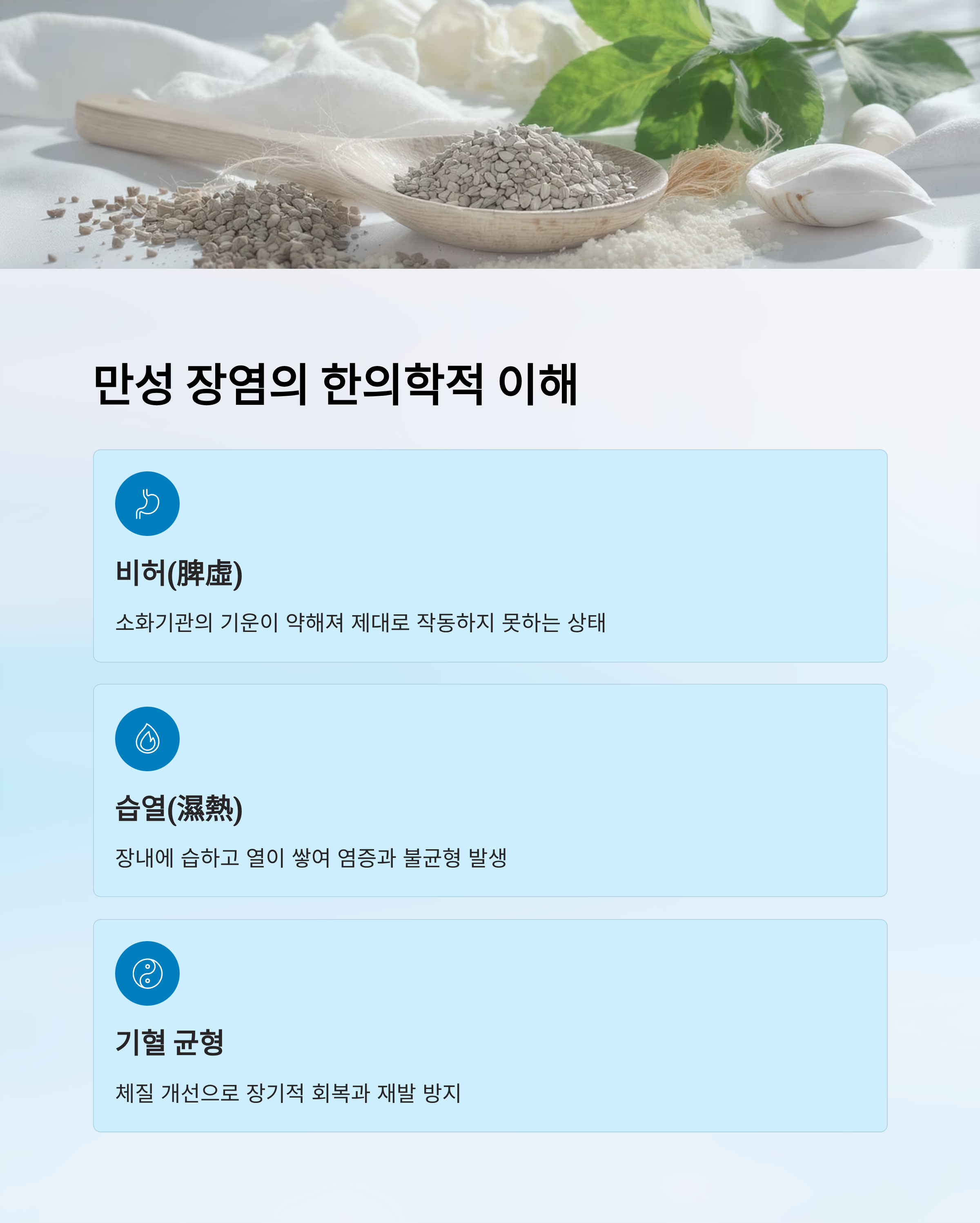 한의학에서는 만성 장염을 ‘비허(脾虛)’ 혹은 ‘습열(濕熱)’과 같은 개념으로 바라봐요. 즉, 소화기관의 기운이 약해져서 제대로 작동하지 못하거나, 장내에 습하고 열이 쌓이면서 염증과 불균형이 생긴다는 뜻이에요. 이럴 경우, 단순히 염증을 줄이는 것이 아니라, 장의 기능 자체를 튼튼하게 해주는 게 핵심이죠.