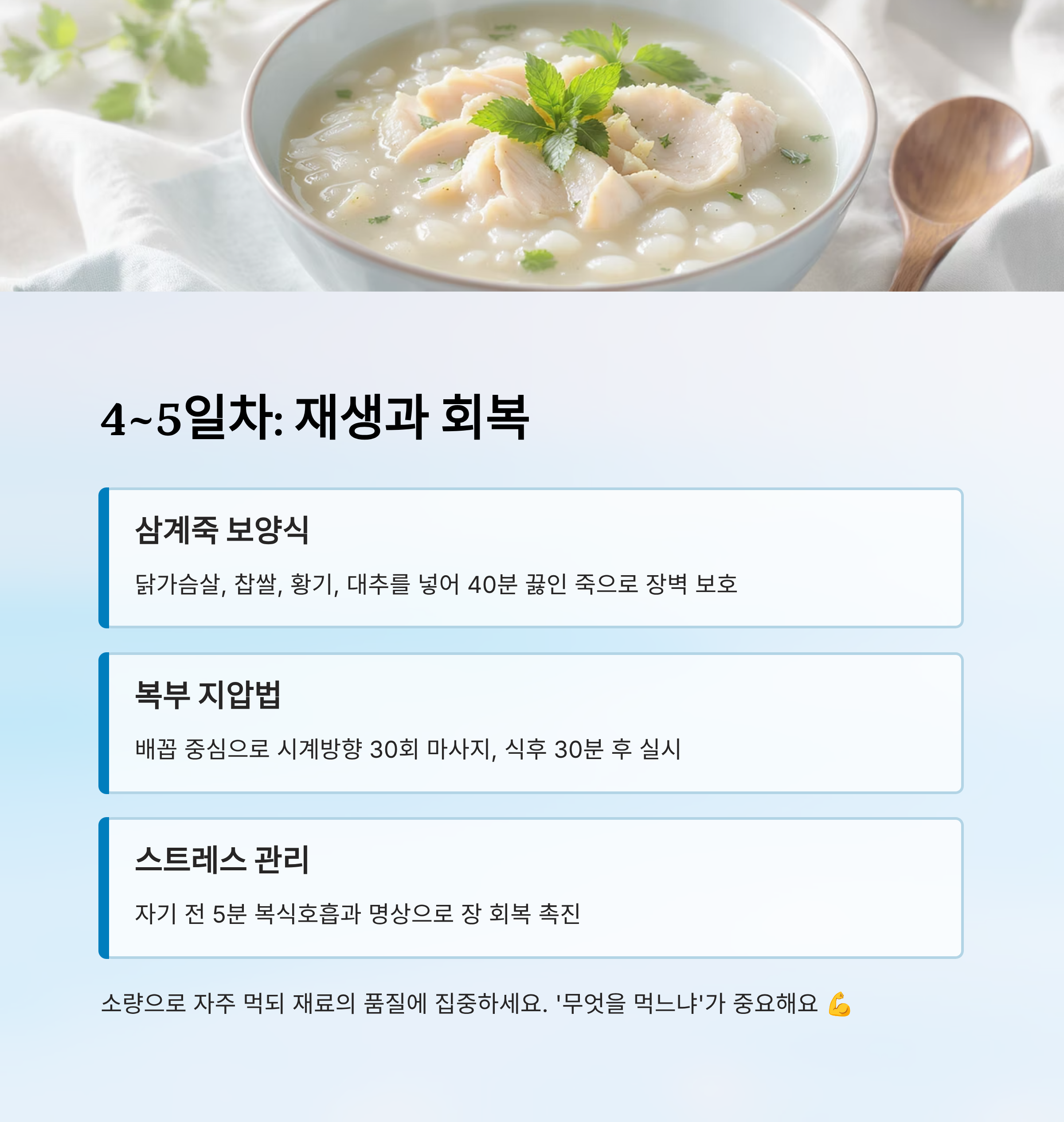 또한 4~5일차에는 복부 자극을 주는 간단한 지압도 효과적이에요. 배꼽을 중심으로 시계 방향으로 30회 손바닥을 문지르듯 마사지하면 장내 순환이 촉진되고, 가스나 복부 팽만도 줄어들 수 있어요. 식후 30분 후에 해주는 것이 좋아요.