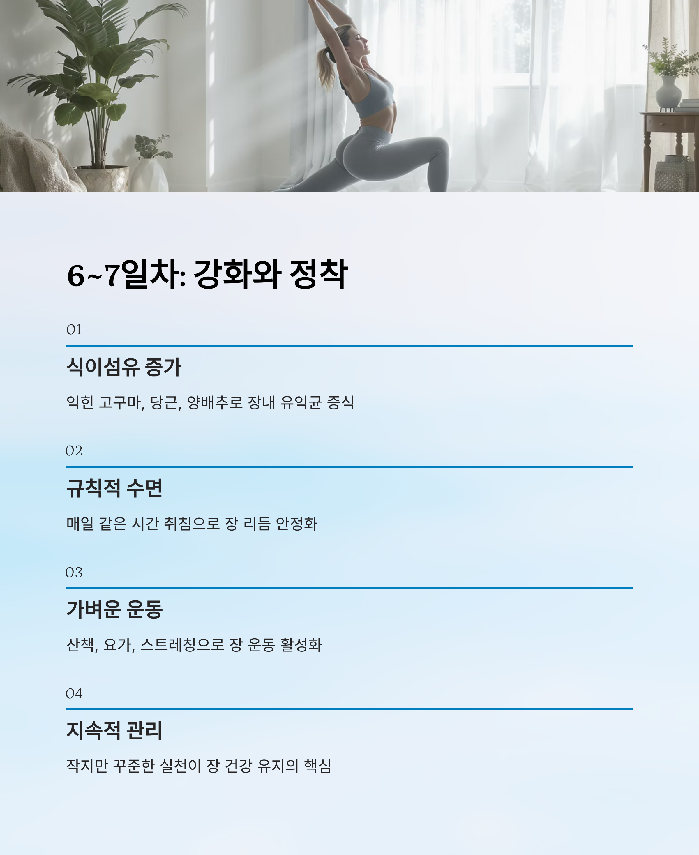 이제 6~7일차는 장 건강 프로젝트의 마무리 단계예요. 앞에서 장을 쉬게 하고 회복시켰다면, 이제는 다시 튼튼하게 유지할 수 있도록 강화해주는 시간이죠. 이 시기의 목표는 장내 환경을 안정화하고 재발을 막는 거예요.