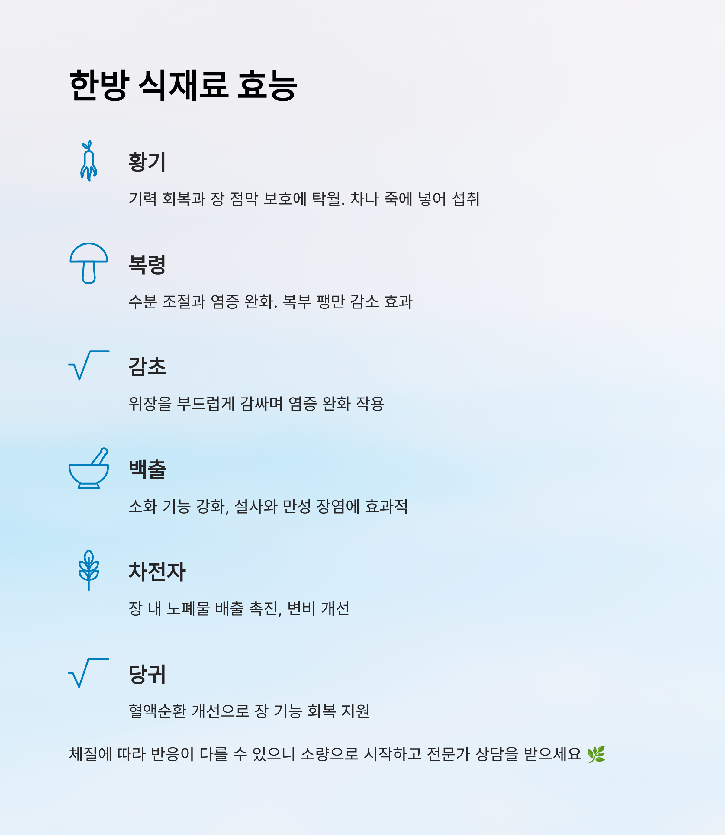 장 건강을 위해 자주 사용하는 한방 식재료는 대부분 오랜 세월 동안 쓰여 온 약용 식물이에요. 각 재료는 장을 따뜻하게 하고 염증을 줄이거나, 기운을 보강하거나, 장 내 환경을 정돈하는 데 특화되어 있답니다.