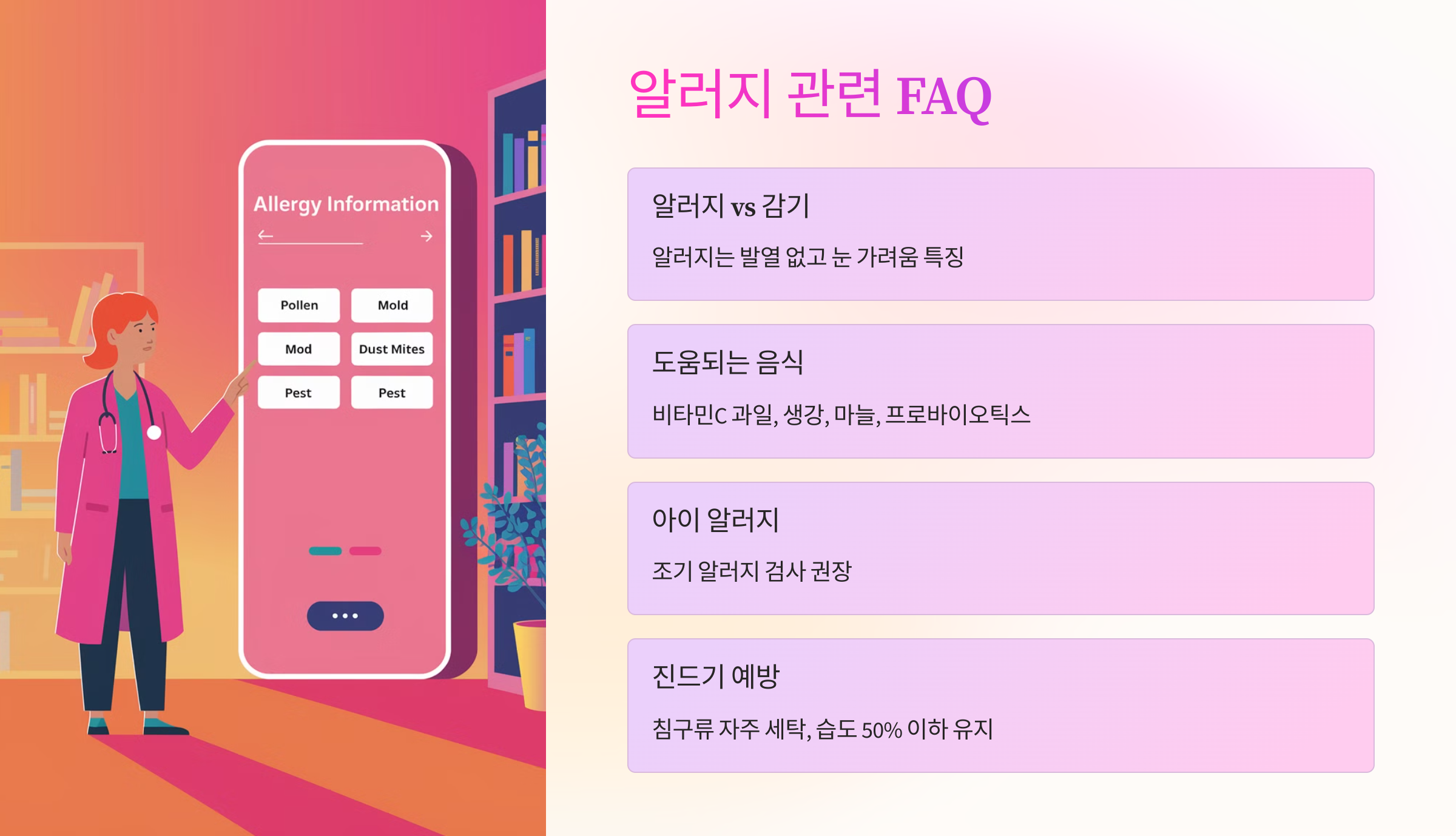 치료 방법은 증상의 강도와 개인의 건강 상태에 따라 달라질 수 있어요. 약물 사용 시에는 반드시 의사나 약사와 상의하는 것이 좋아요. 이제 다음으로는 일상생활에서 알러지 관리를 위한 팁들을 알려드릴게요! 🧹