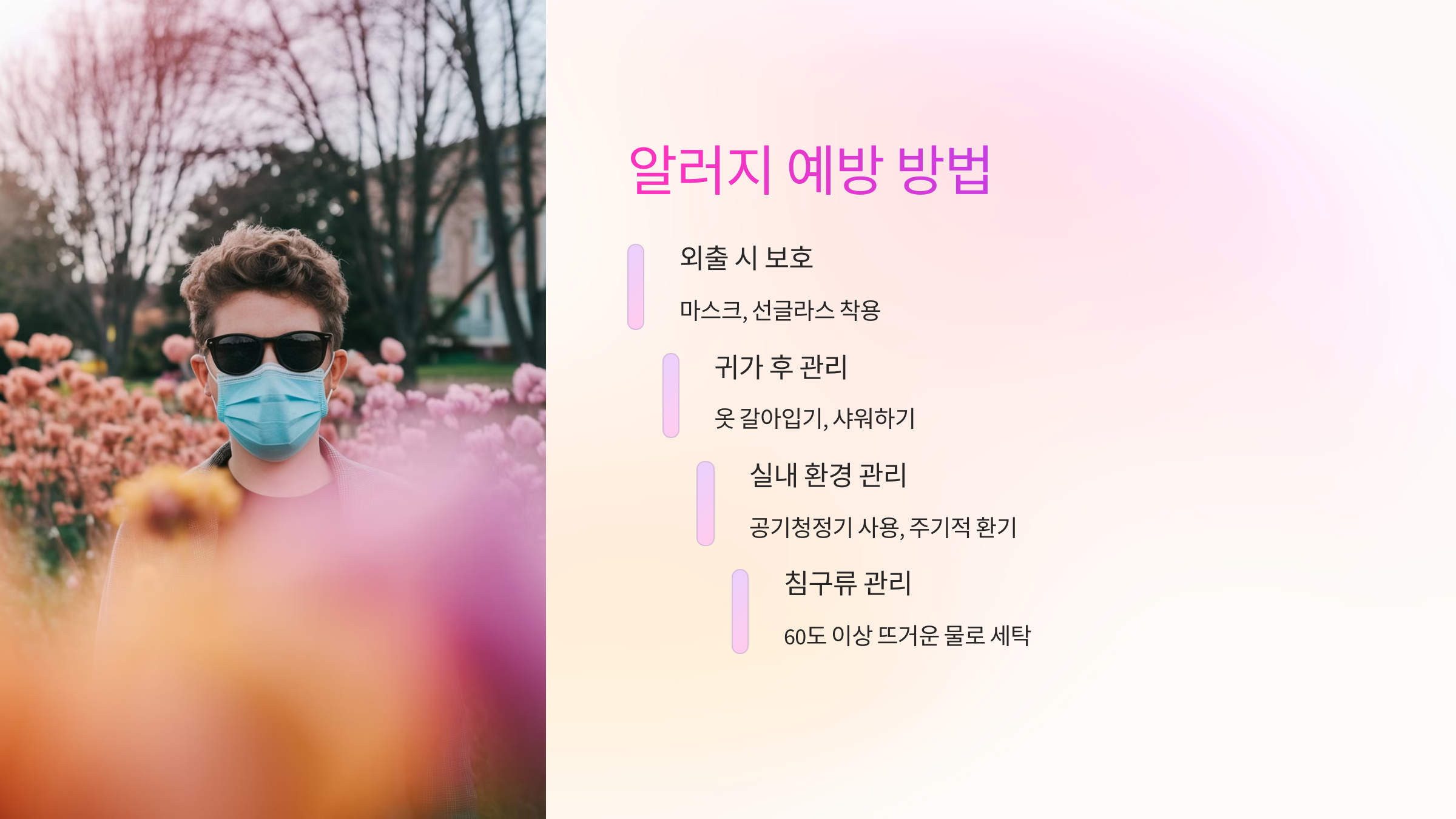 계절성 알러지를 예방하려면 알러지 유발 물질(알러젠)과의 접촉을 최소화하는 것이 가장 중요해요. 특히 꽃가루나 미세먼지가 많은 날에는 외출을 자제하고, 부득이하게 외출할 때는 마스크와 선글라스를 착용하는 것이 좋아요.