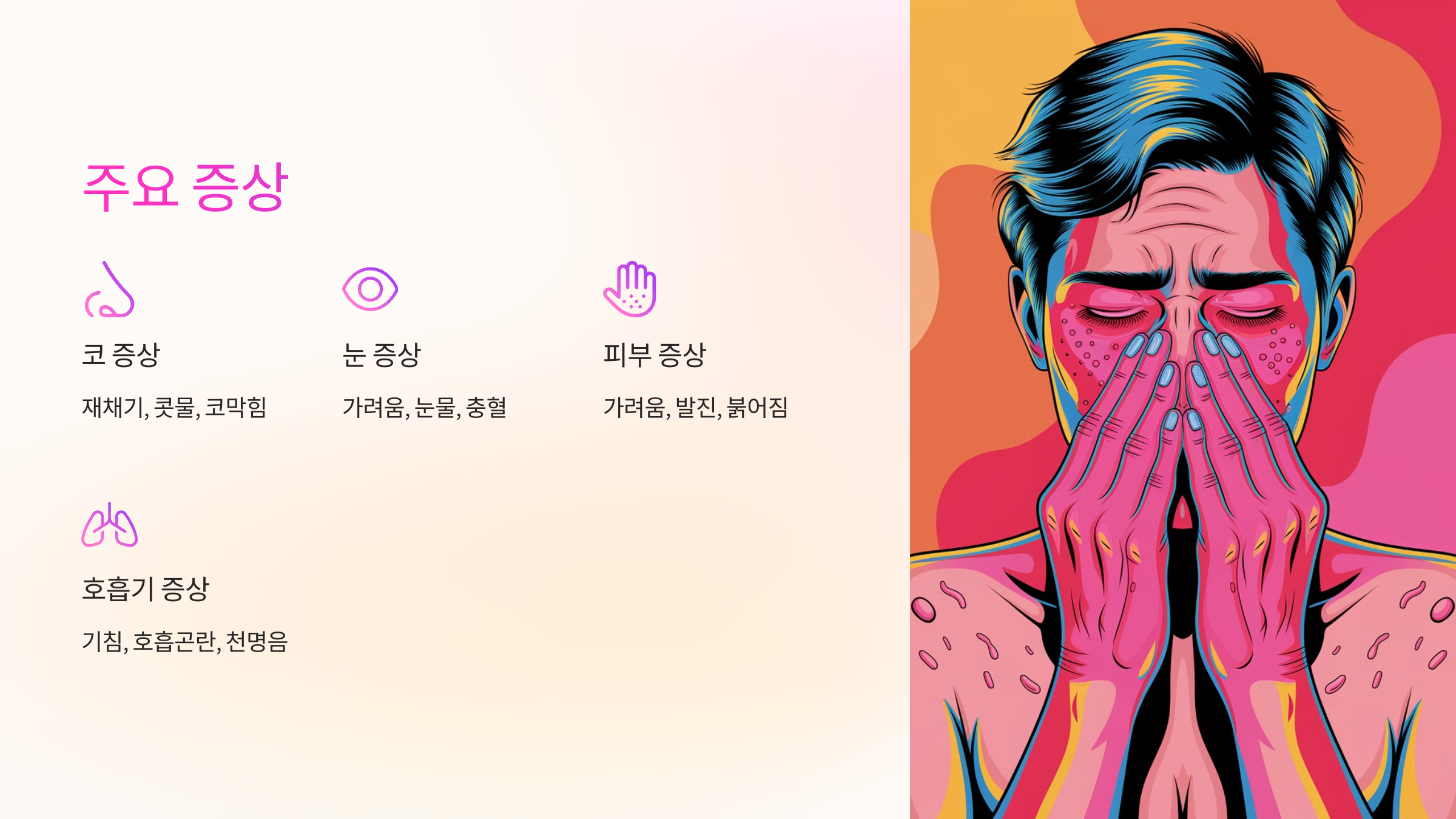 | 꽃가루 | 봄, 가을 | 재채기, 코막힘 | 외출 시 마스크 착용 |