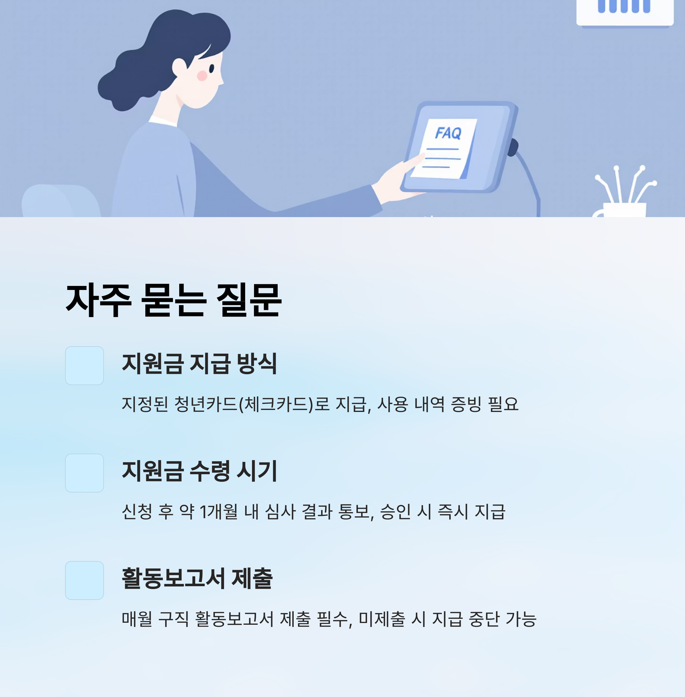 청년구직활동지원금을 신청할 때 가장 많이 하는 질문들이 있어요. 예를 들어, '지원금은 언제부터 받을 수 있나요?', '신청 자격은 어떻게 되나요?' 같은 질문들이에요. 이러한 궁금증을 미리 해결해 두면 신청 과정이 훨씬 수월해질 거예요.