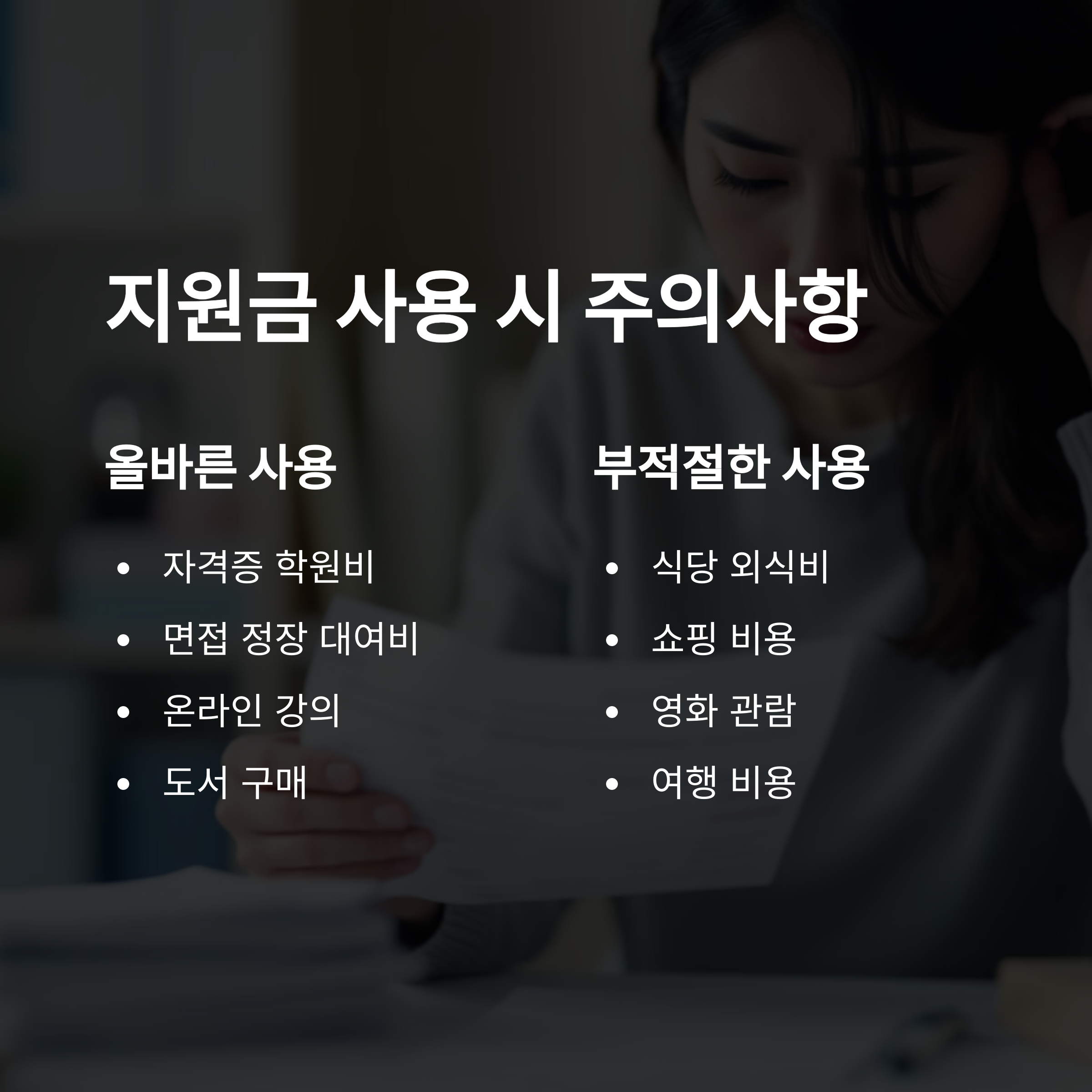 또한, 취업준비에 필요한 자격증 학원비나 교재 구입비로도 사용할 수 있어요. 어학 시험 준비, 코딩 부트캠프 등 실질적인 취업 스펙을 쌓을 수 있는 곳에 지원금을 활용하면 큰 도움이 될 거예요.
