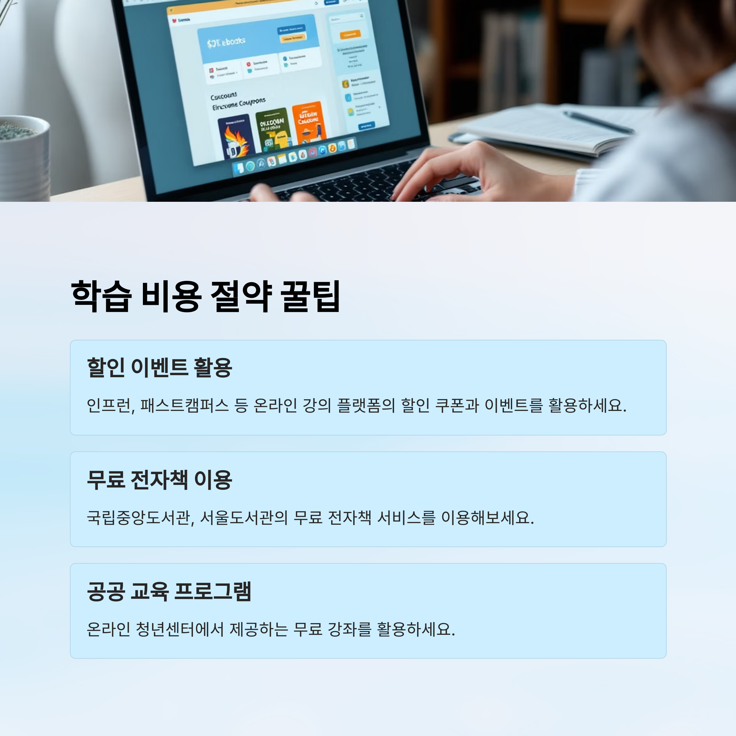 또한, 도서나 학습 자료를 구매할 때는 공공 도서관이나 전자도서관을 활용하면 비용을 줄일 수 있어요. 서울도서관, 국립중앙도서관의 전자책 서비스는 무료로 이용할 수 있답니다. 📚