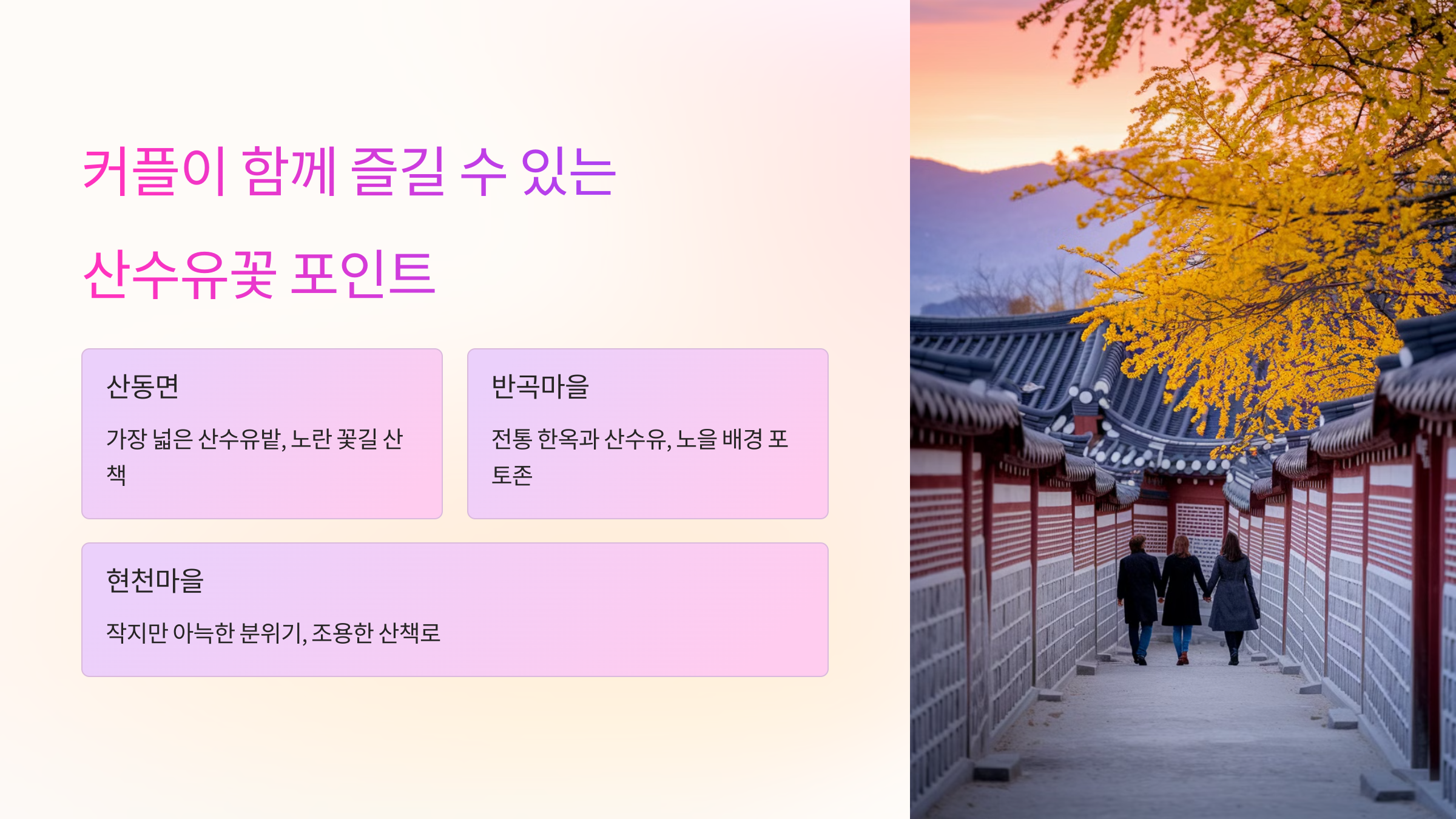 이제 커플이 함께 즐길 수 있는 산수유꽃 포인트부터 데이트 코스, 그리고 준비물까지 하나하나 소개해 드릴게요. 놓치지 말고 읽어보세요! 😊