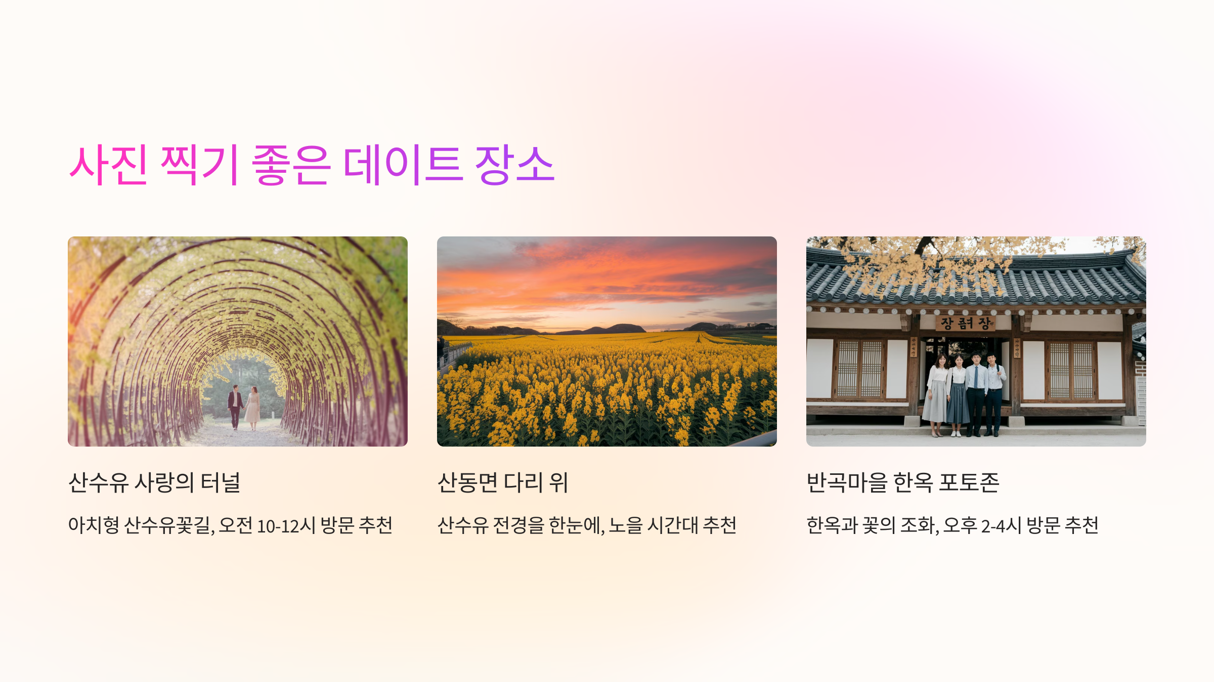 장소 | 특징 | 추천 촬영 시간 |