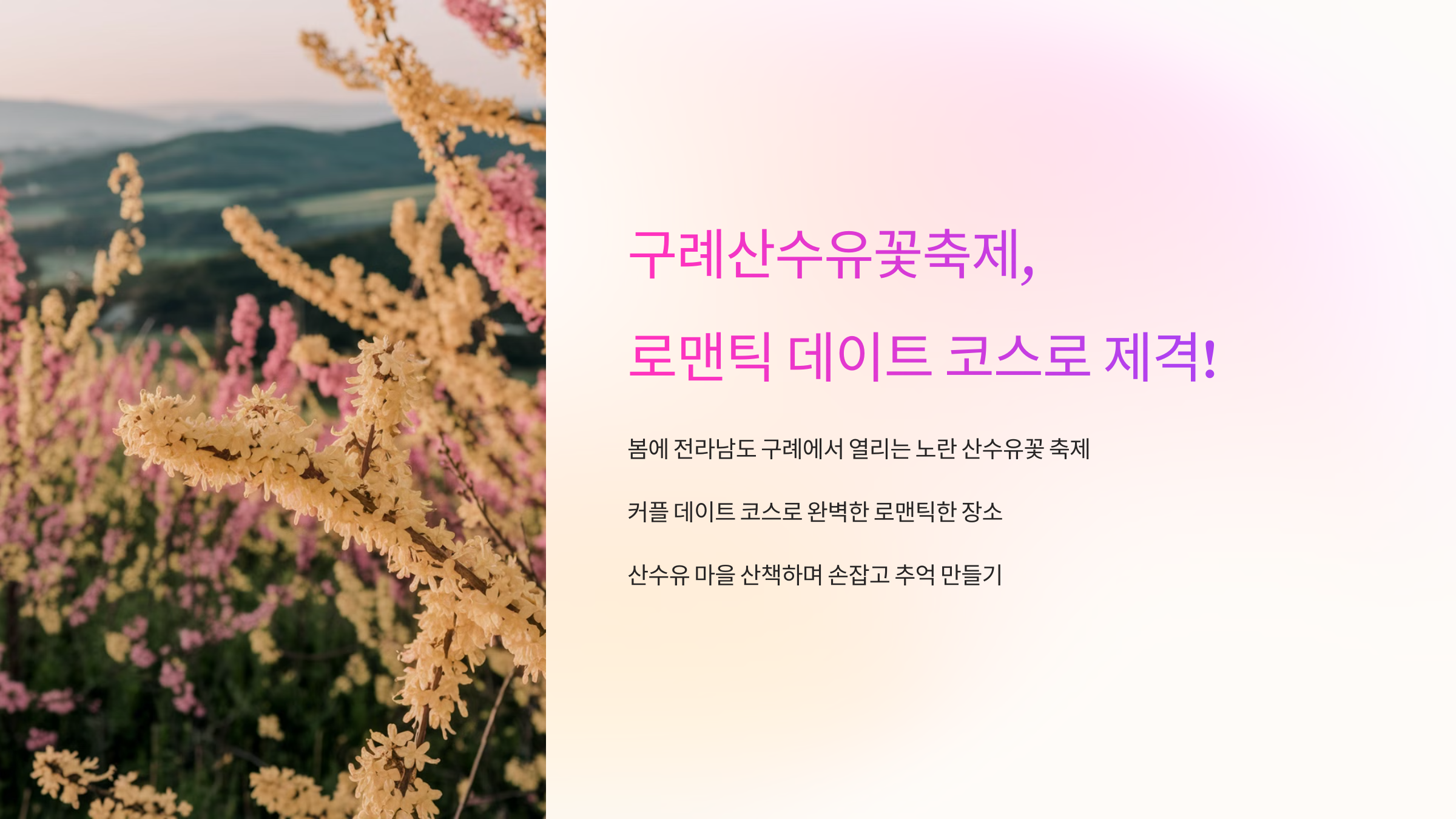제가 생각했을 때, 구례산수유꽃축제는 봄 데이트의 정석이에요. 산수유 마을을 걷다 보면 자연스럽게 손을 잡고 걷게 되고, 곳곳에서 열리는 이벤트와 사진 명소가 많아서 추억을 만들기에 딱이에요.