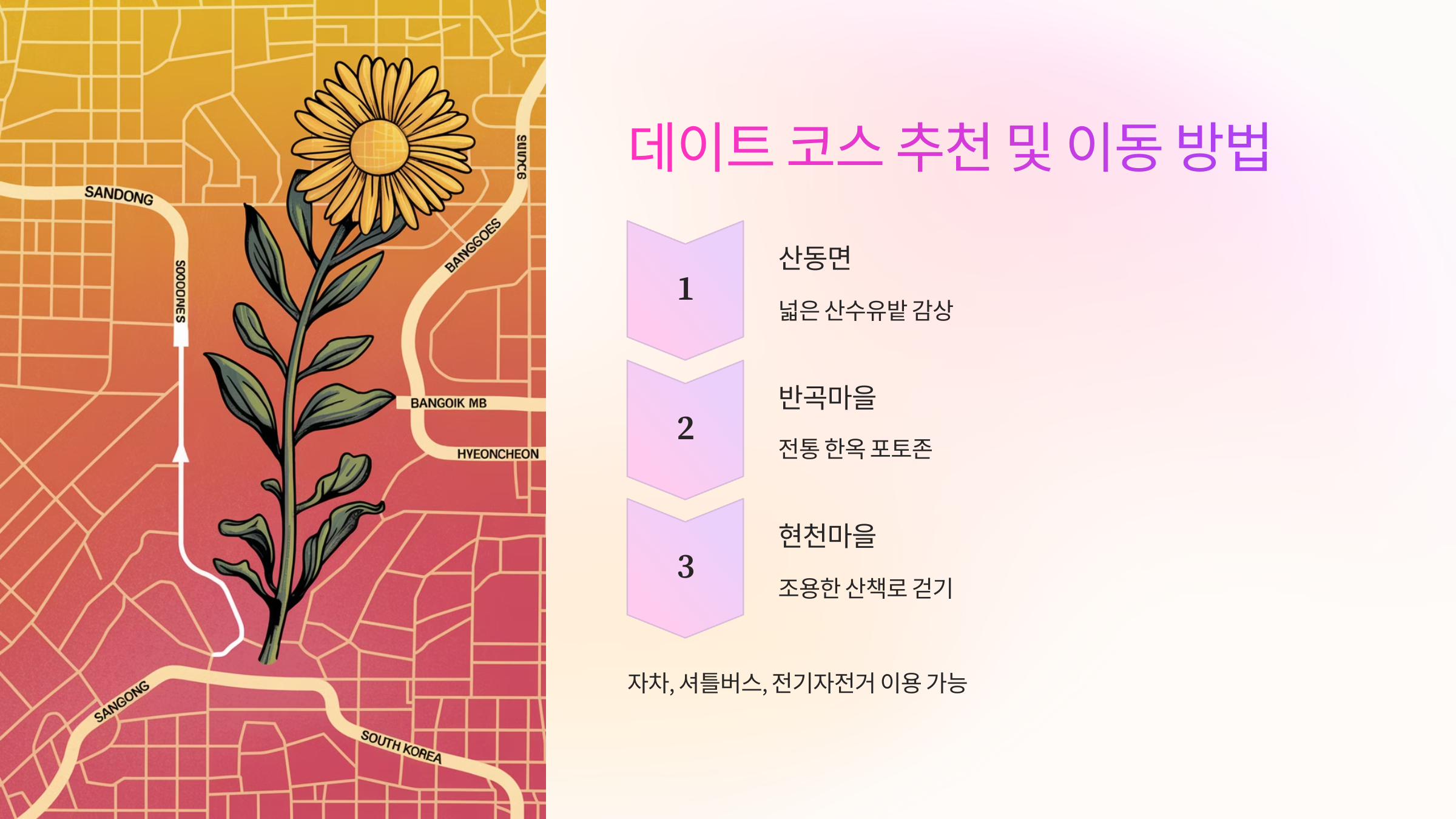 가장 추천하는 코스는 산동면 - 반곡마을 - 현천마을 순서예요. 이렇게 이동하면 주요 포인트를 모두 지나면서, 꽃도 보고 맛집도 즐길 수 있어요.