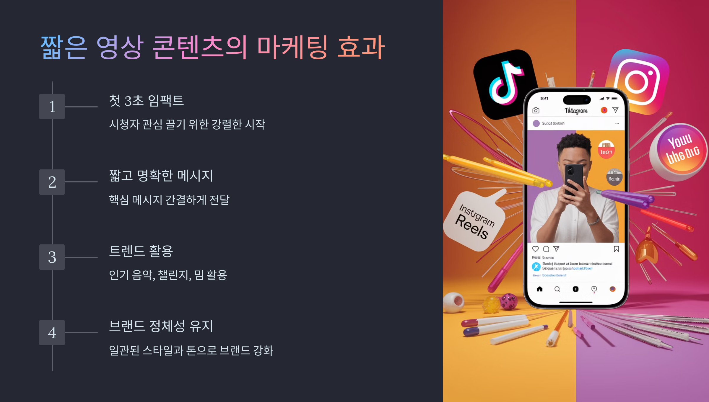 | 첫 3초에 임팩트를 줘요 | 시청자가 처음 3초 내에 관심을 끌어야 해요. 강렬한 시작이 중요해요. |