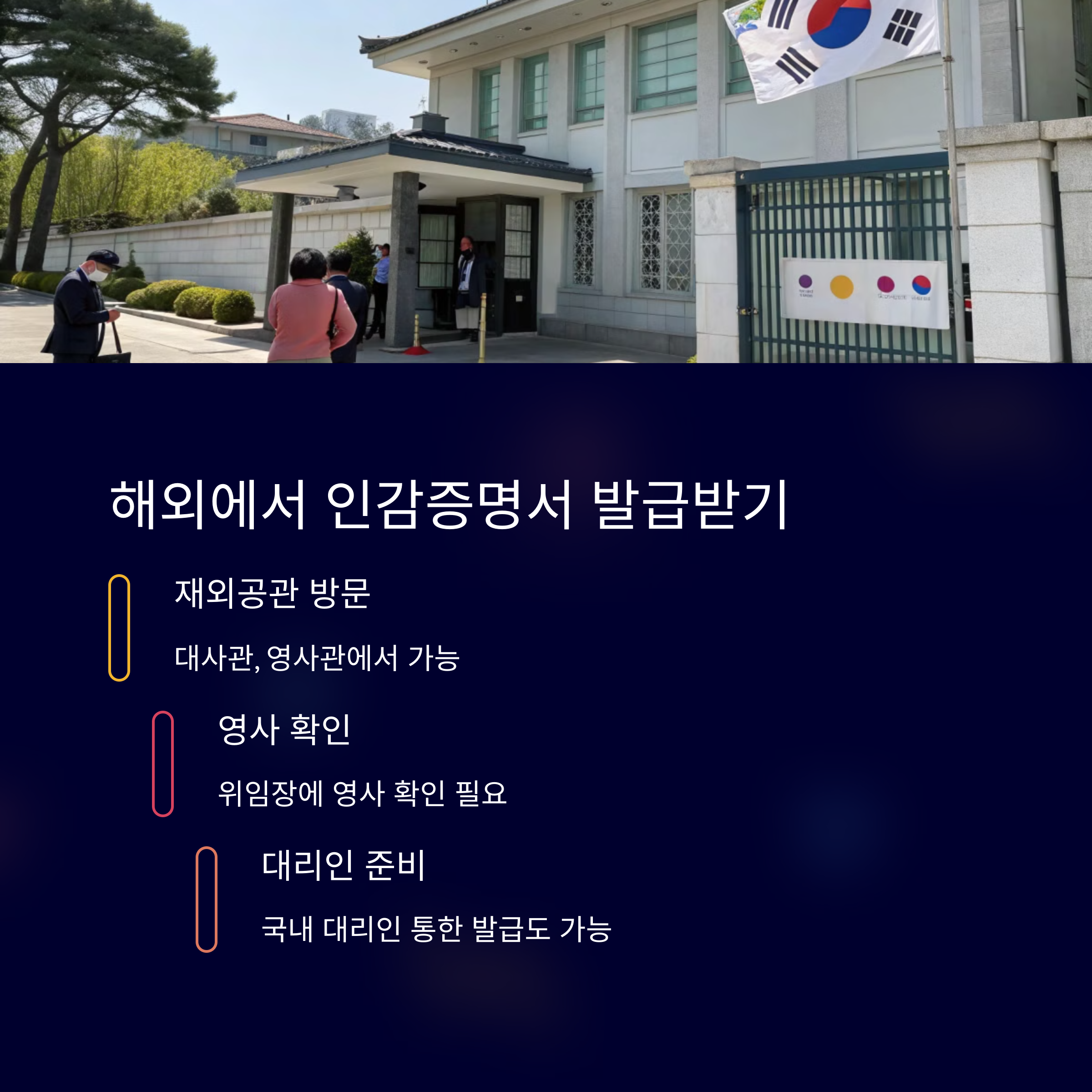 해외에 있을 때도 인감증명서를 발급받아야 하는 경우가 있어요. 이때는 현지의 한국 영사관이나 대사관을 방문하면 돼요. 본인이 직접 방문해야 하고, 신분증과 등록된 인감도장이 필요해요.