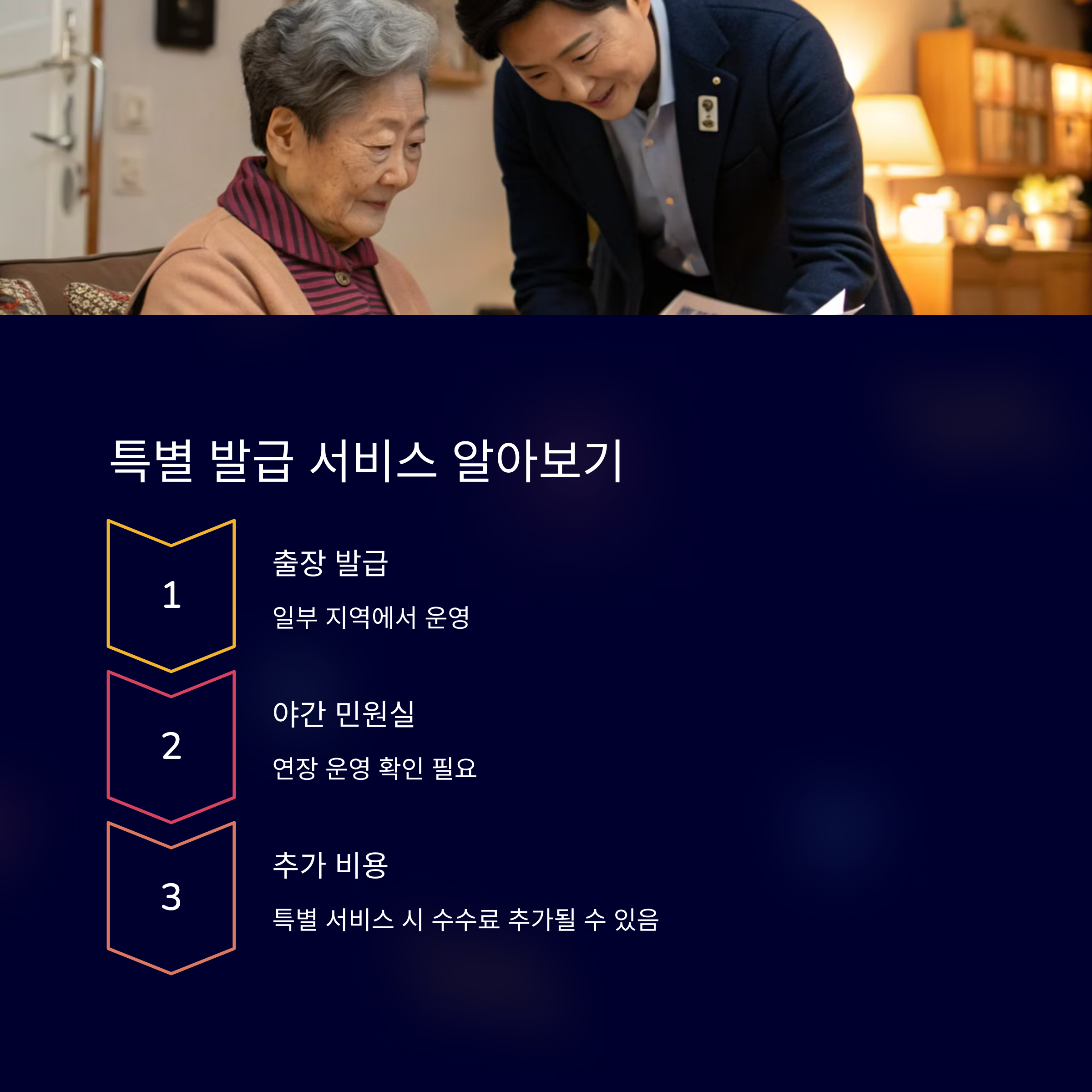 만약 동사무소나 시청 방문이 어려운 상황이라면 출장소나 특별 발급 서비스를 활용할 수 있어요. 일부 지역에서는 고령자나 거동이 불편한 분들을 위해 '찾아가는 민원 서비스'를 운영해요.