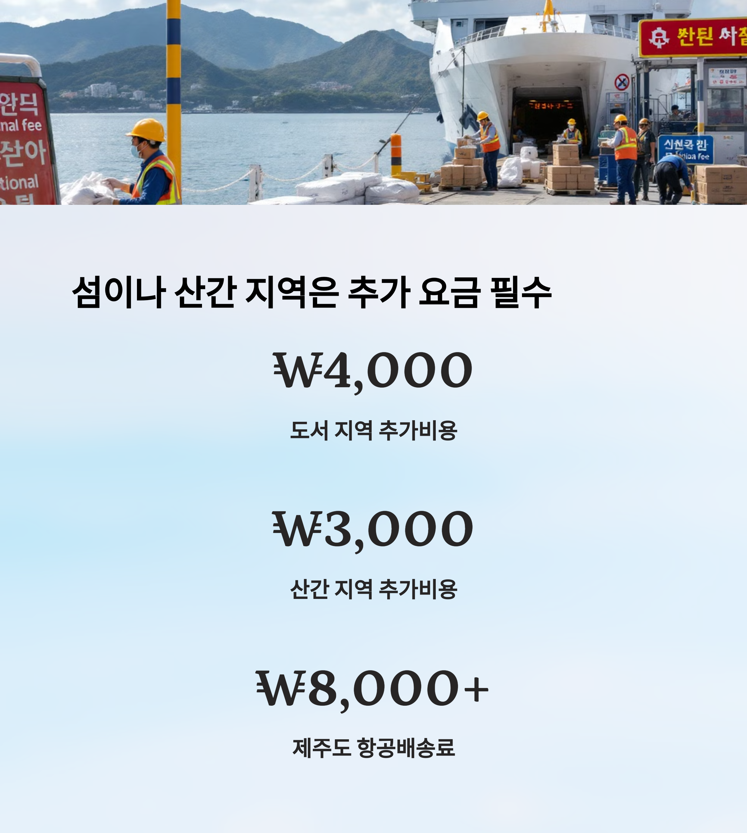 이런 지역은 항공이나 선박을 이용해야 하기 때문에 추가 요금이 발생해요. 보통 3,000원~5,000원이 추가되고, 무게가 늘어나면 비용이 더 올라가요. 🏷️