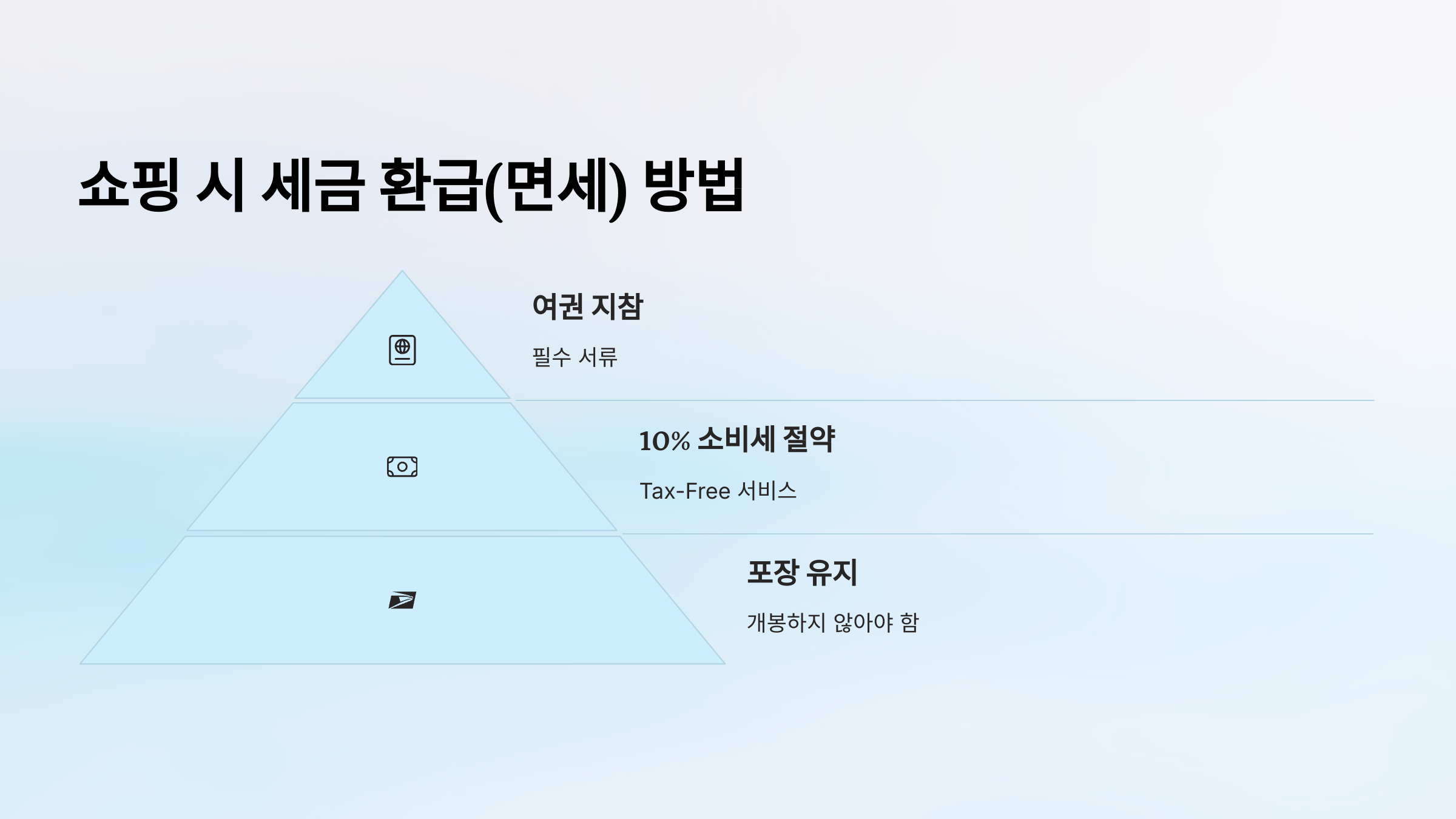 면세를 받기 위해서는 여권을 반드시 지참해야 해요. 결제 시 여권을 제시하면 세금을 제외한 가격으로 결제가 가능해요. 일부 매장은 면세 카운터에서 따로 처리를 해야 하니 안내를 꼭 확인해 주세요.
