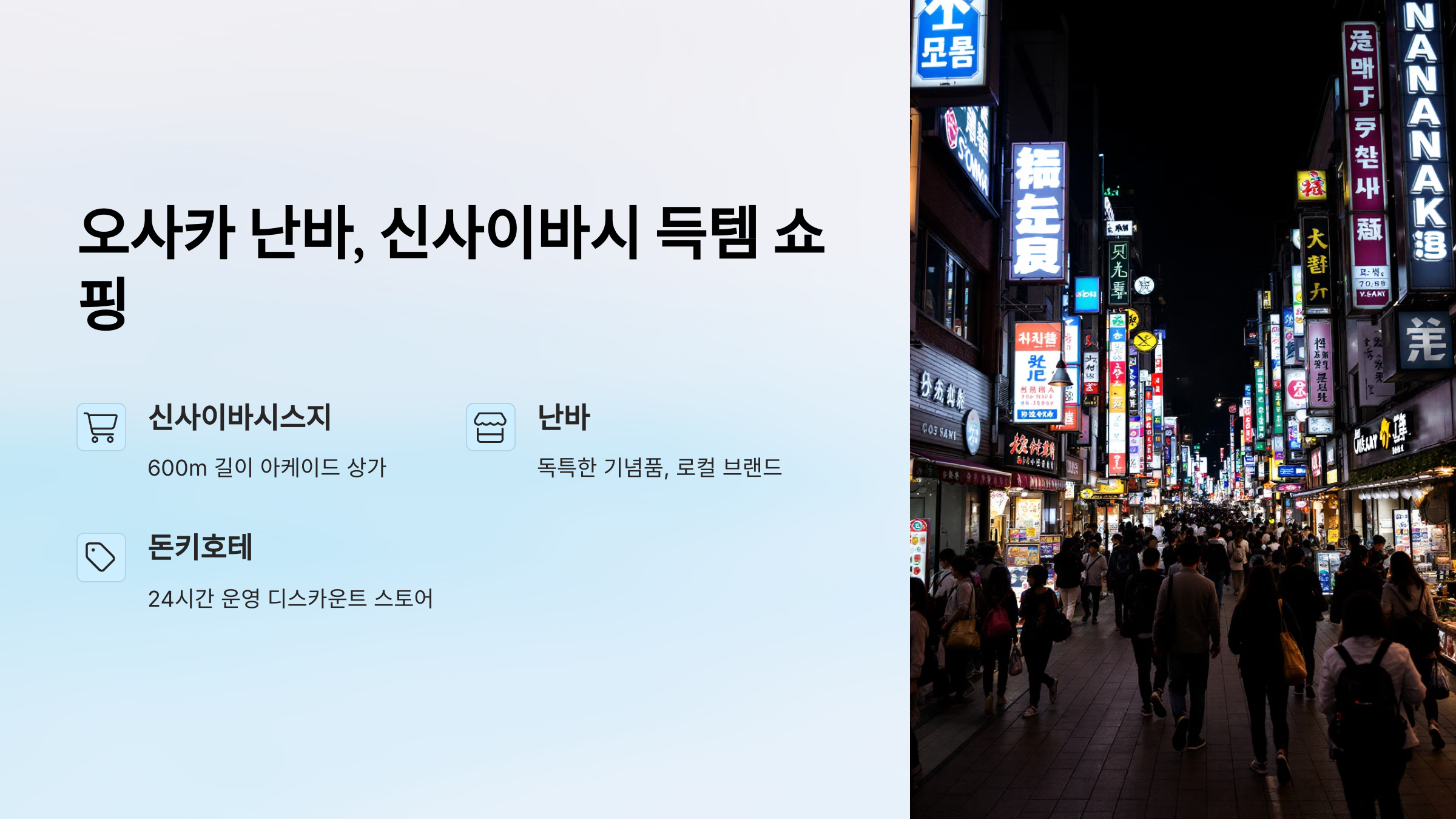 오사카에서는 특히 돈키호테를 추천해요. 24시간 운영하는 곳이 많아서 밤늦게까지 쇼핑을 즐길 수 있거든요! 🕙 또, 신사이바시스지의 다양한 브랜드 매장은 걷기만 해도 눈이 즐거워진답니다.😊
