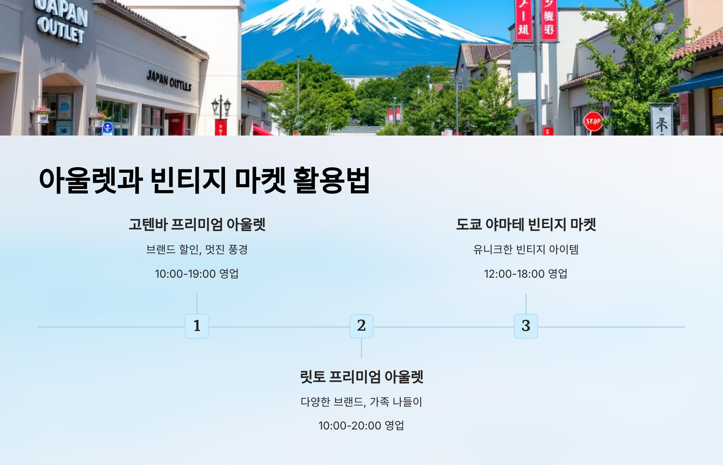 아울렛에서는 시즌별 세일을 활용하면 더욱 저렴하게 쇼핑할 수 있어요. 빈티지 마켓에서는 현금 결제가 유리할 때도 있으니 현금을 준비해 가면 좋아요! 🛍️
