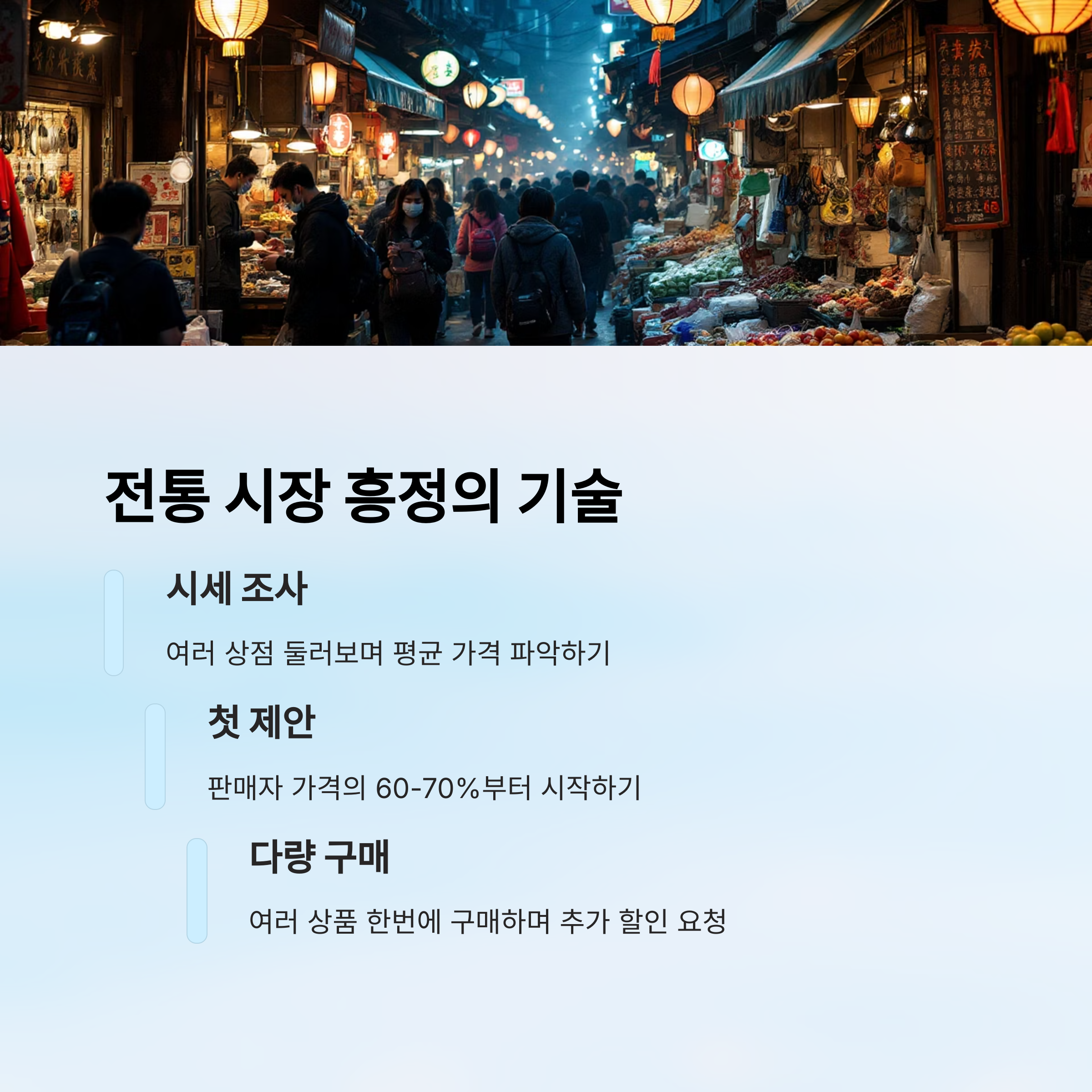 전통 시장에서는 흥정이 필수예요! 가격을 처음부터 낮게 제시하고, 웃으며 거래하면 좋은 가격에 구매할 수 있어요. 보통 처음 제시된 가격의 30~50% 정도 낮춰 부르는 것이 좋아요.