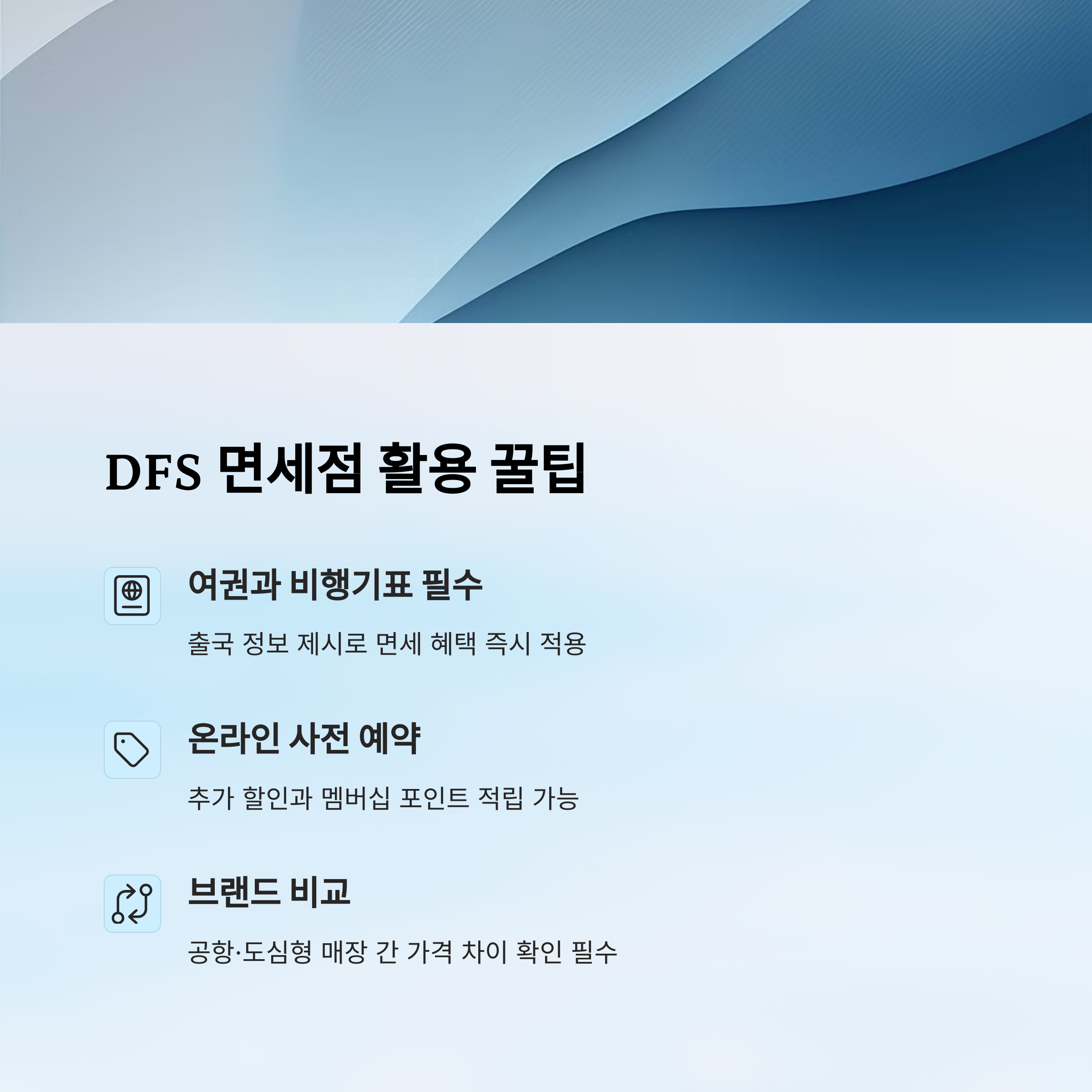 DFS 면세점에서는 출국 시 구매한 물건을 공항에서 픽업할 수 있는 '픽업 서비스'를 활용해 보세요. 사전에 온라인 예약을 통해 할인 혜택을 받을 수도 있어요. 💳