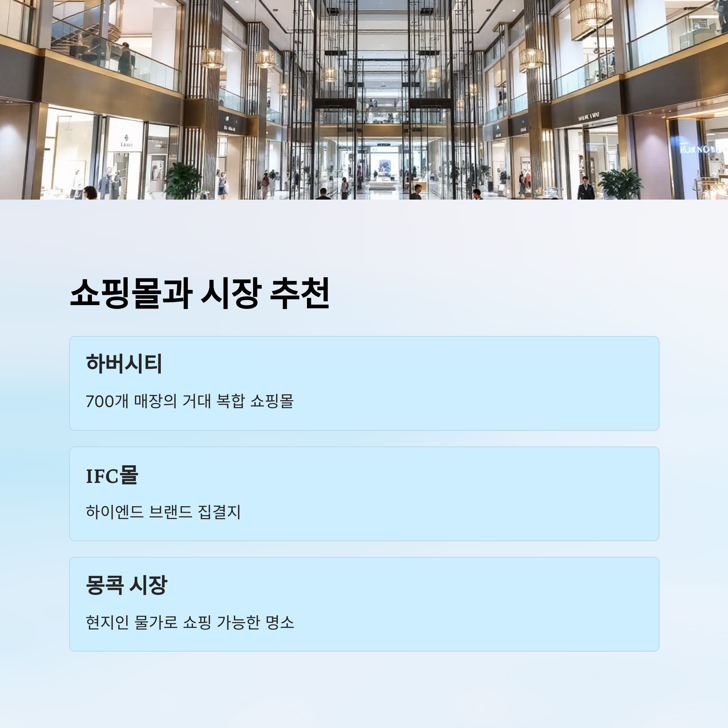 | 하버시티 | 홍콩 최대 쇼핑몰, 고급 브랜드 많음 | 명품 가방, 의류, 화장품 |