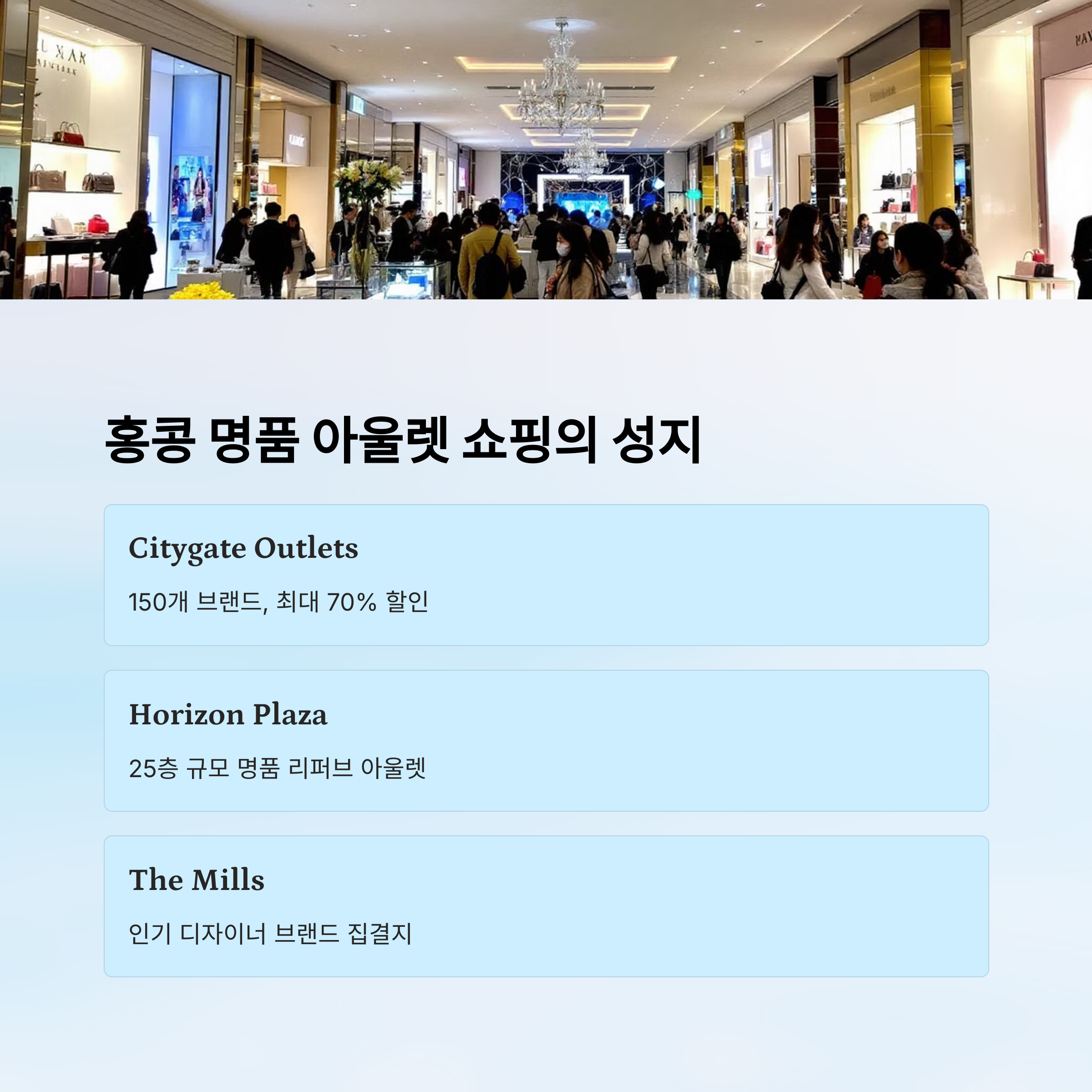 홍콩에는 다양한 명품 아울렛이 있어요. 특히 'Citygate Outlets(시티게이트 아울렛)'은 홍콩 유일의 아울렛 쇼핑몰로, 나이키, 아디다스, 코치, 퓨라다(Prada) 등 다양한 브랜드를 할인된 가격에 구매할 수 있어요. 💸