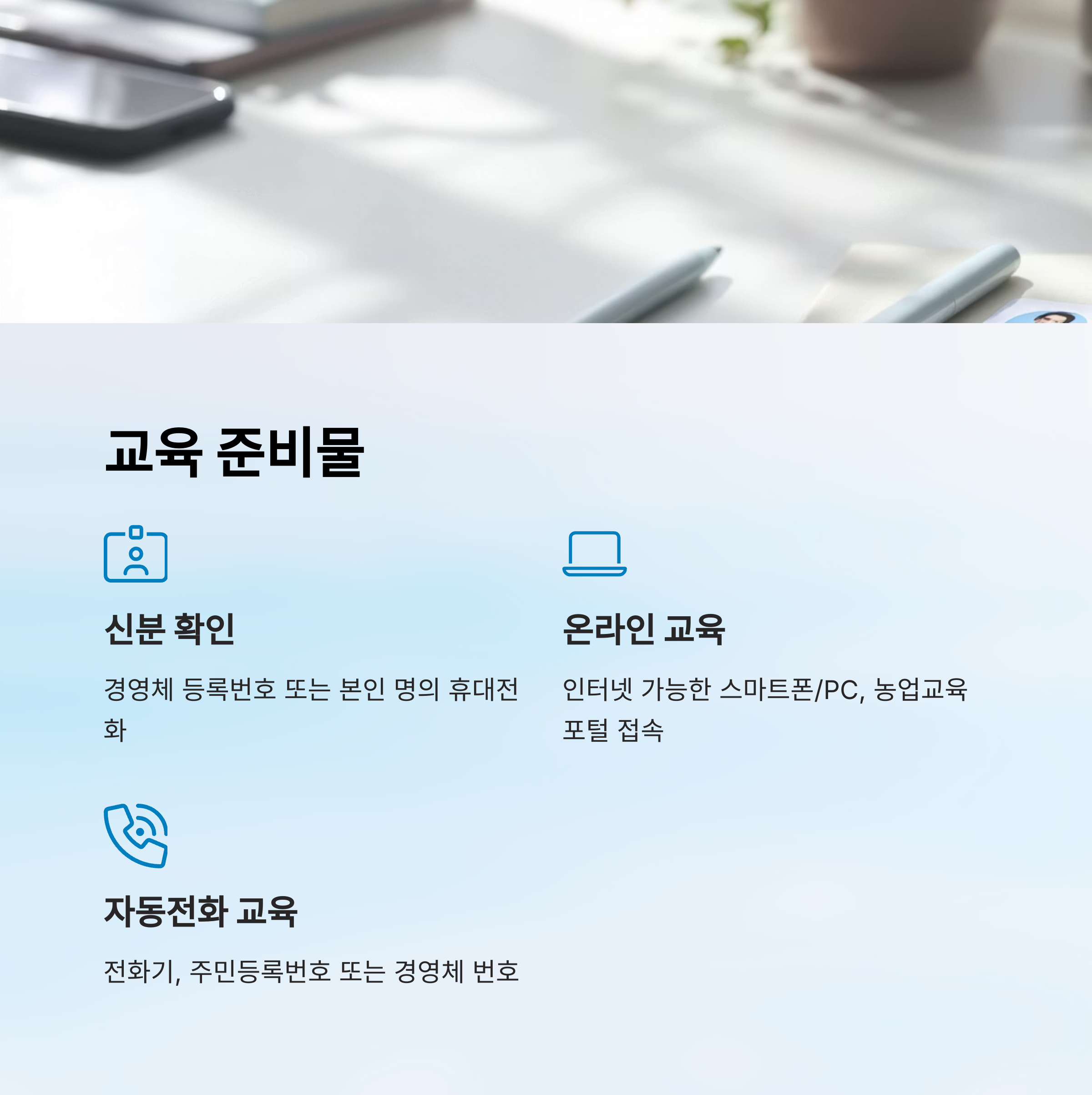 또한 인터넷이 가능한 스마트폰이나 PC도 있어야 하고, 웹사이트 농업교육포털에 접속해야 해요. 인증을 마친 후 강의 영상 시청과 평가를 완료하면 이수 처리가 돼요.