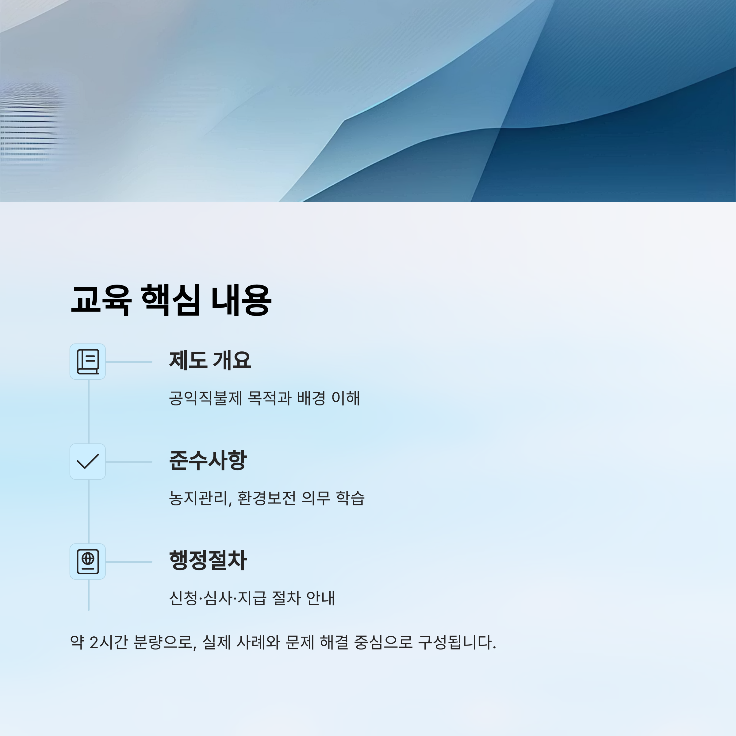 공익직불금 교육에서는 단순히 제도만 설명하는 것이 아니라, 농업인의 역할과 책임, 그리고 실천 방안까지 다양하게 배울 수 있어요. 교육은 약 2시간 분량으로 구성되어 있으며, 실제 사례와 문제 해결 중심으로 운영돼요.