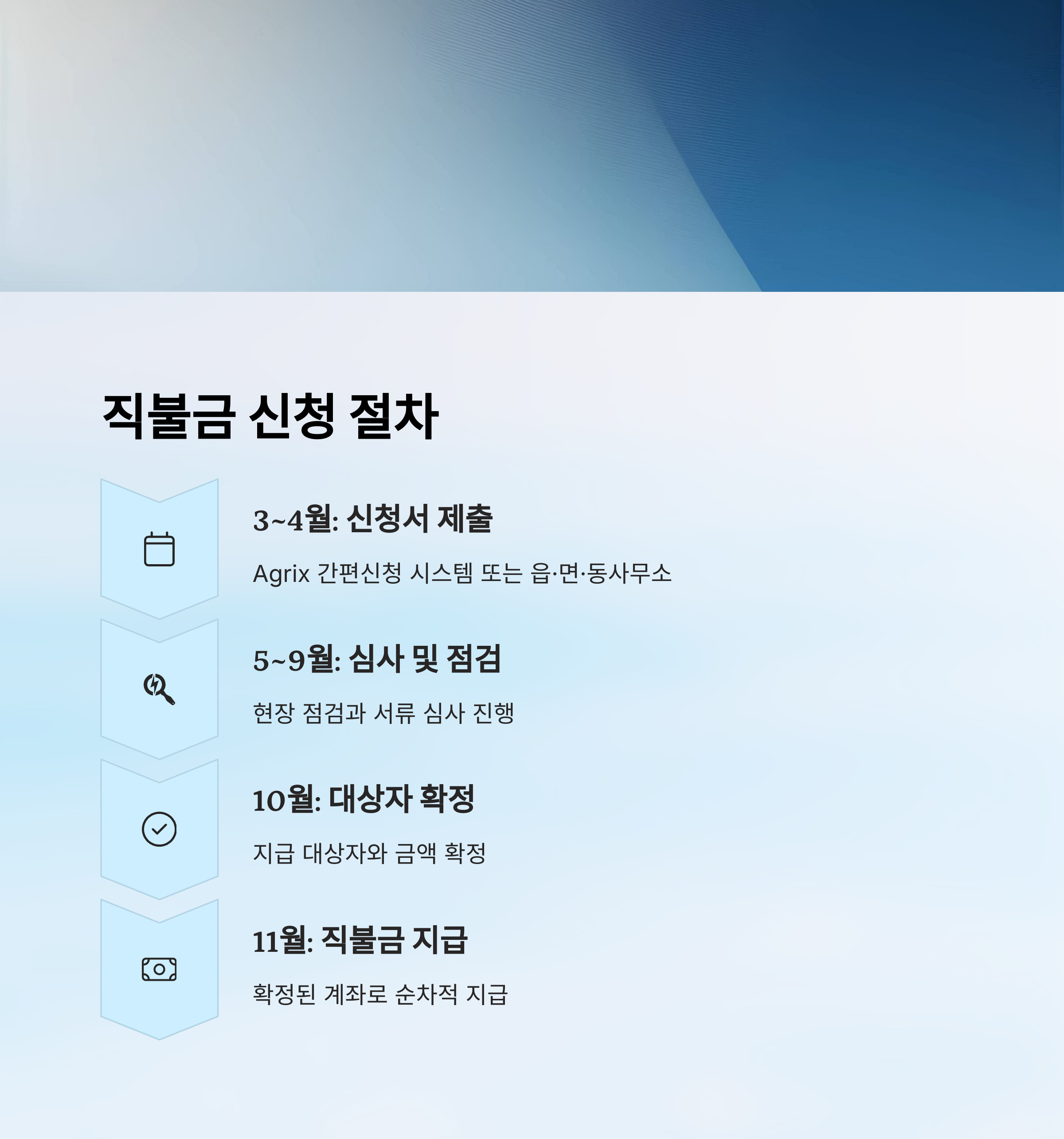 교육을 완료했다면 이제 직불금을 받기 위한 본격적인 절차가 시작돼요. 2025년 기준으로 3~4월에 신청서를 제출해야 해요. 온라인 신청은 Agrix 간편신청 시스템을 이용하면 돼요.