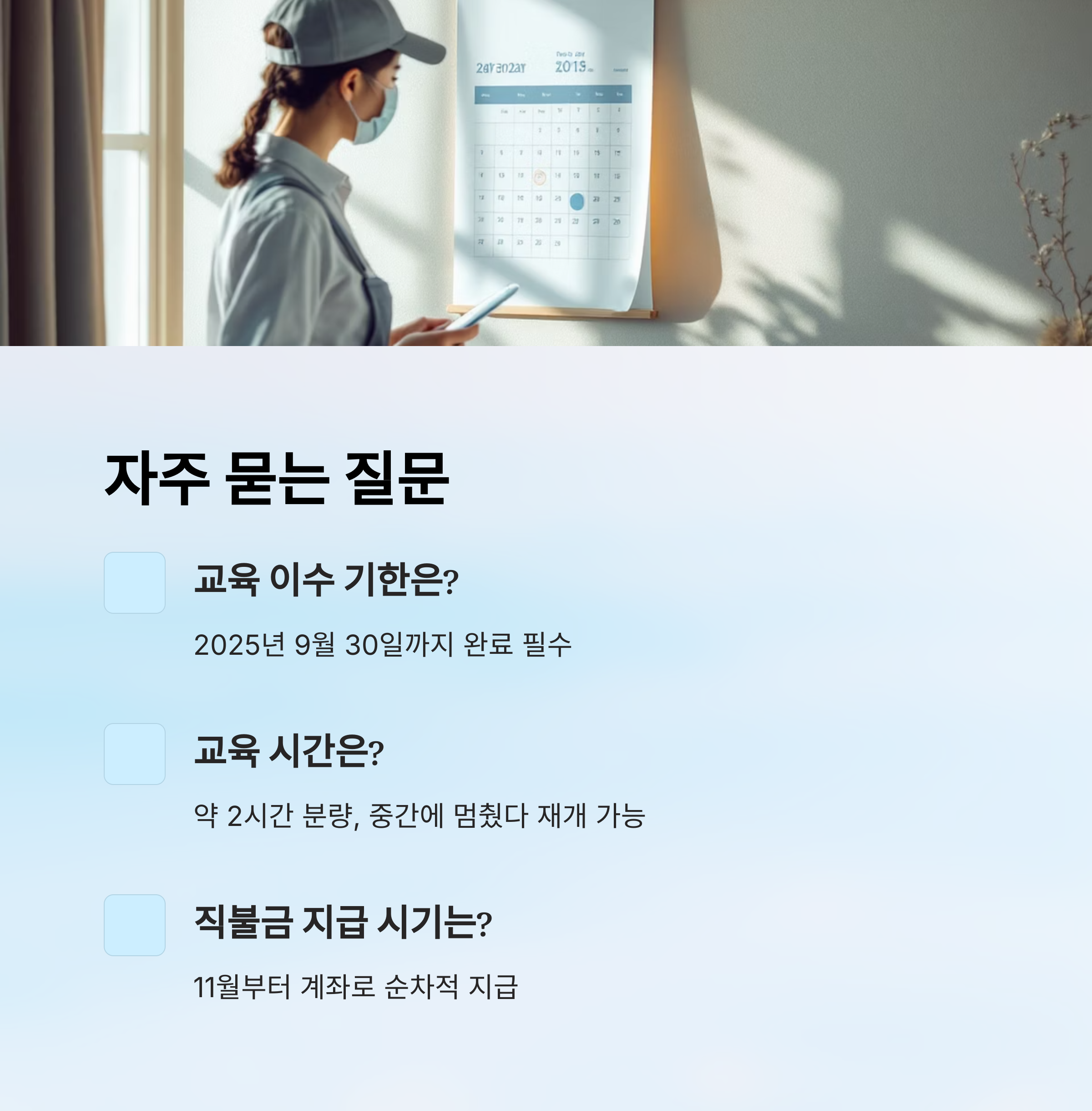 A1. 2025년 9월 30일까지 교육을 반드시 완료해야 해요. 기한을 넘기면 직불금이 감액돼요.