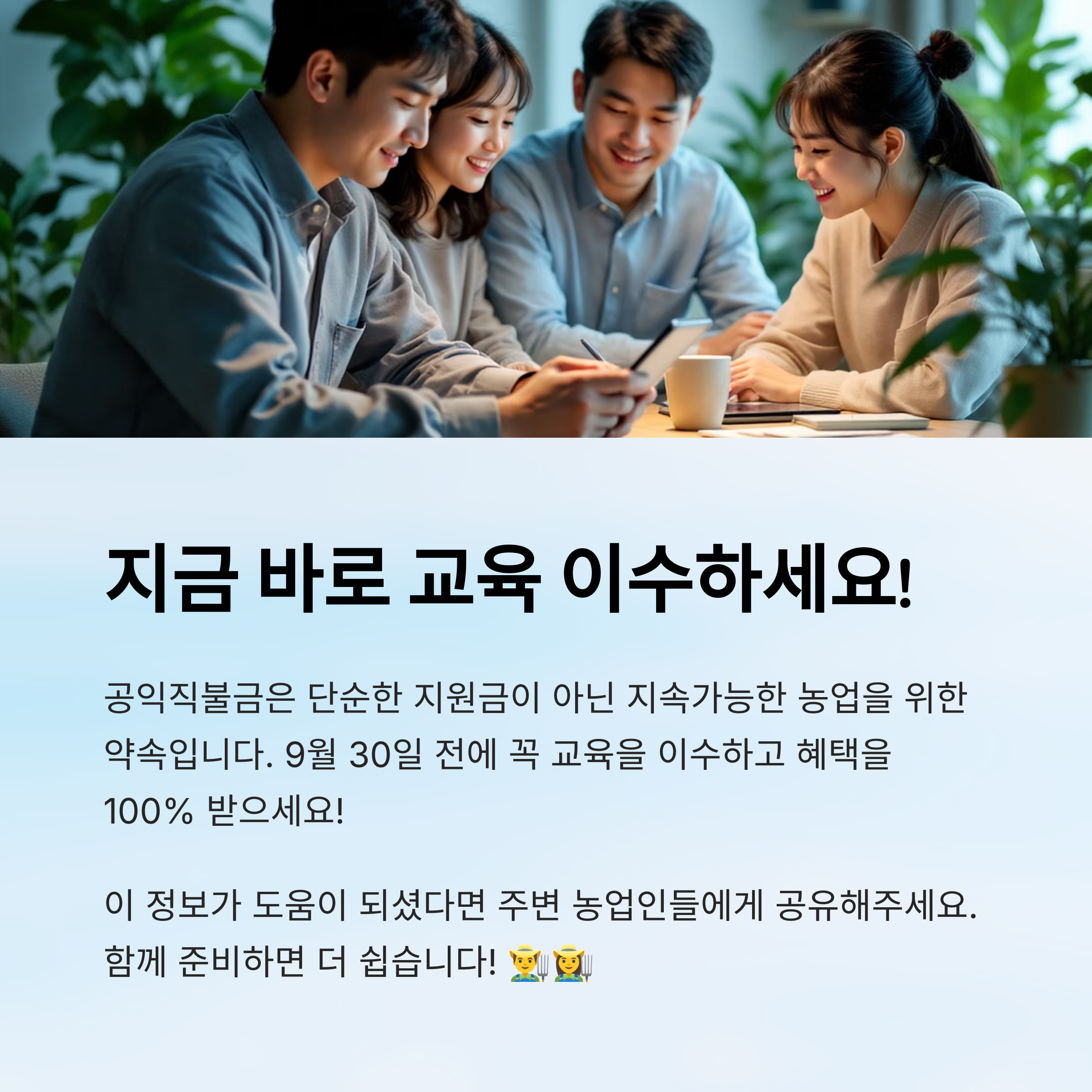 내가 생각했을 때 이 교육은 단순히 직불금을 받기 위한 의무가 아니라, 농업의 미래를 위한 준비 과정 같아요. 지속가능한 농업을 만들기 위한 농업인의 중요한 역할을 직접 느낄 수 있어요. 🌍