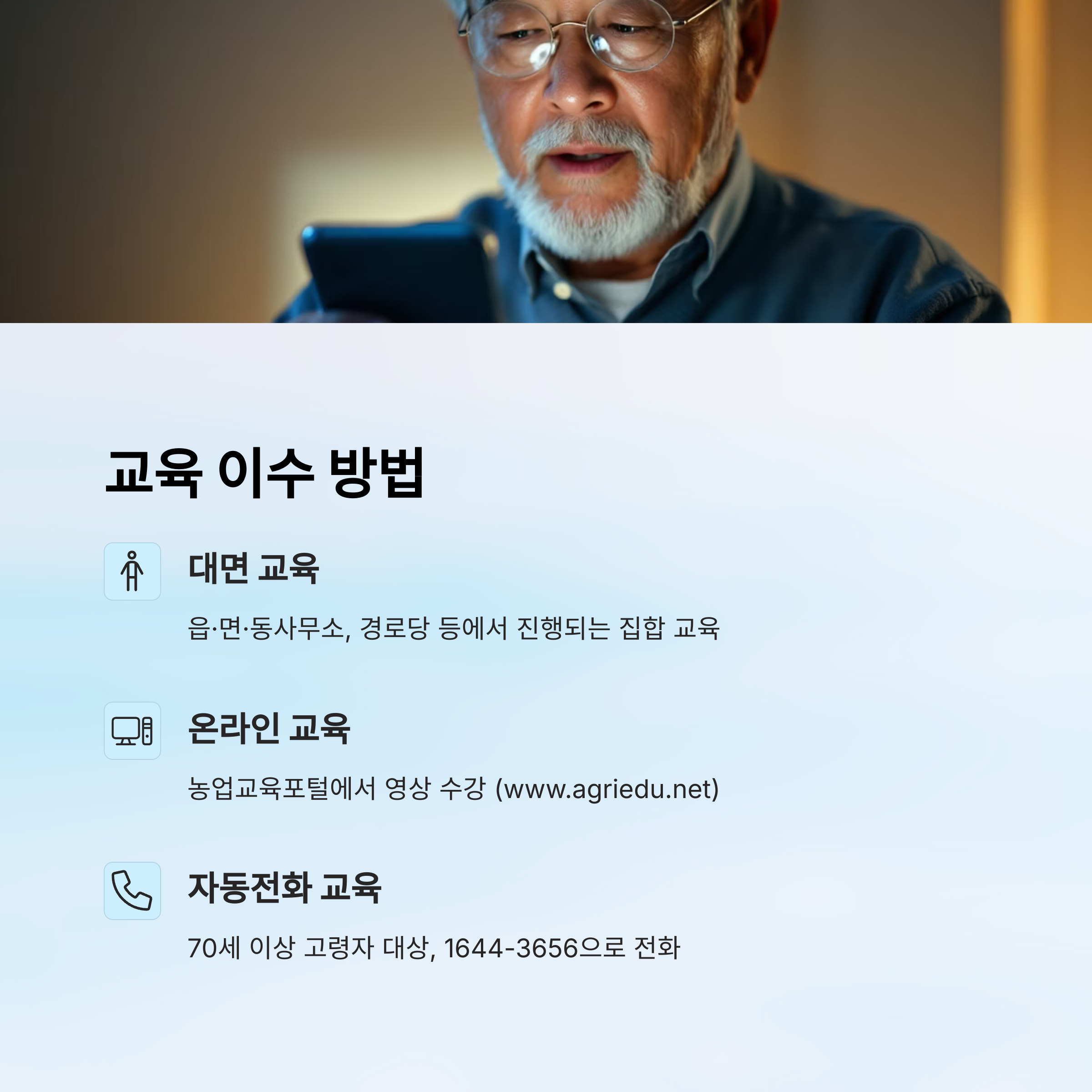 세 번째는 자동전화 교육이에요. 이건 70세 이상 고령 농업인을 위한 방식으로, 1644-3656 번호로 전화를 걸면 음성으로 교육 내용을 들을 수 있답니다. 특별한 기기 없이 전화만 있으면 돼요! ☎️