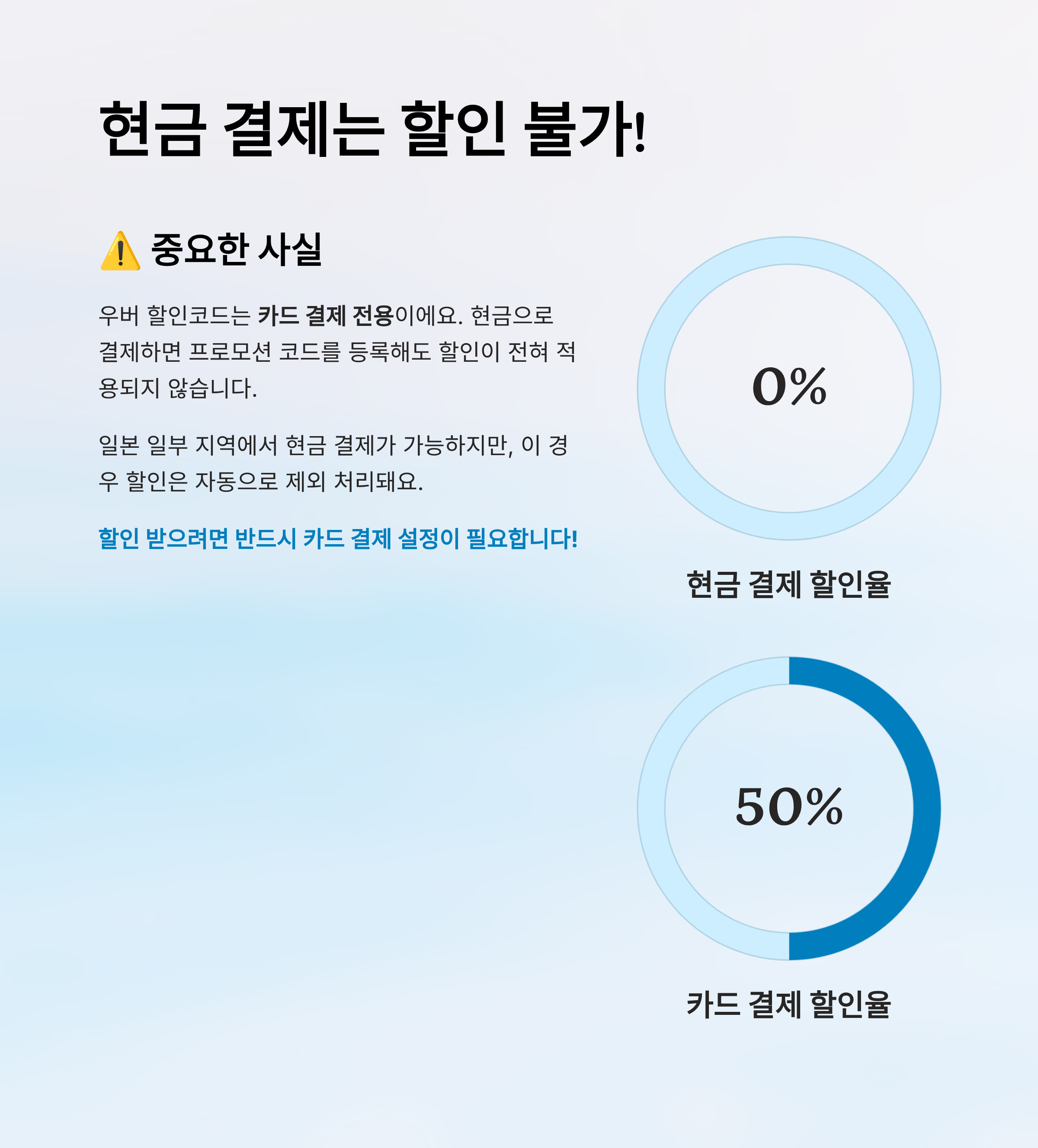 즉, 현금 결제는 우버 할인코드가 적용되지 않는 '예외 결제'예요. 쿠폰이 등록돼 있더라도, 우버 측 시스템에서는 적용할 수 없도록 막혀 있어요.