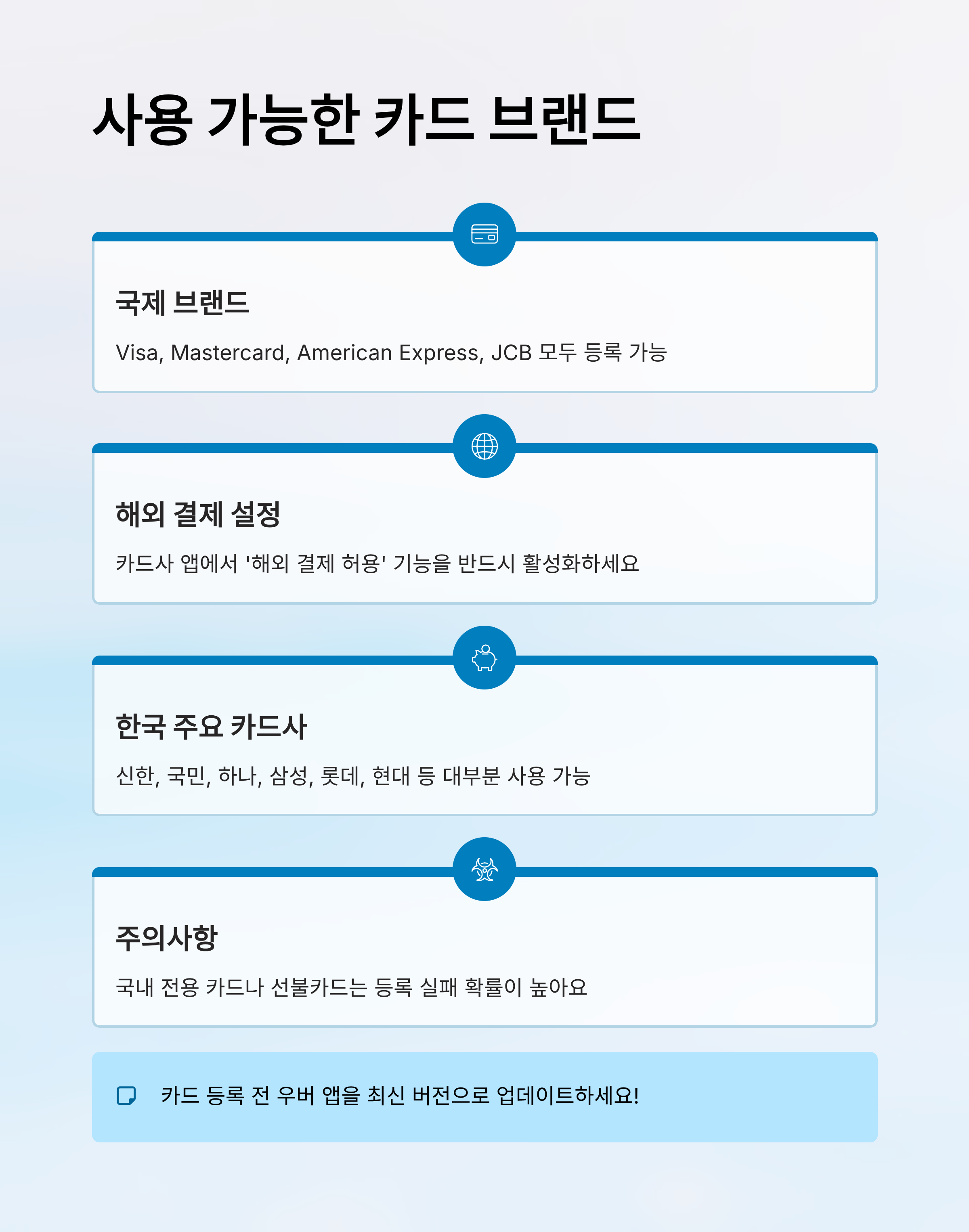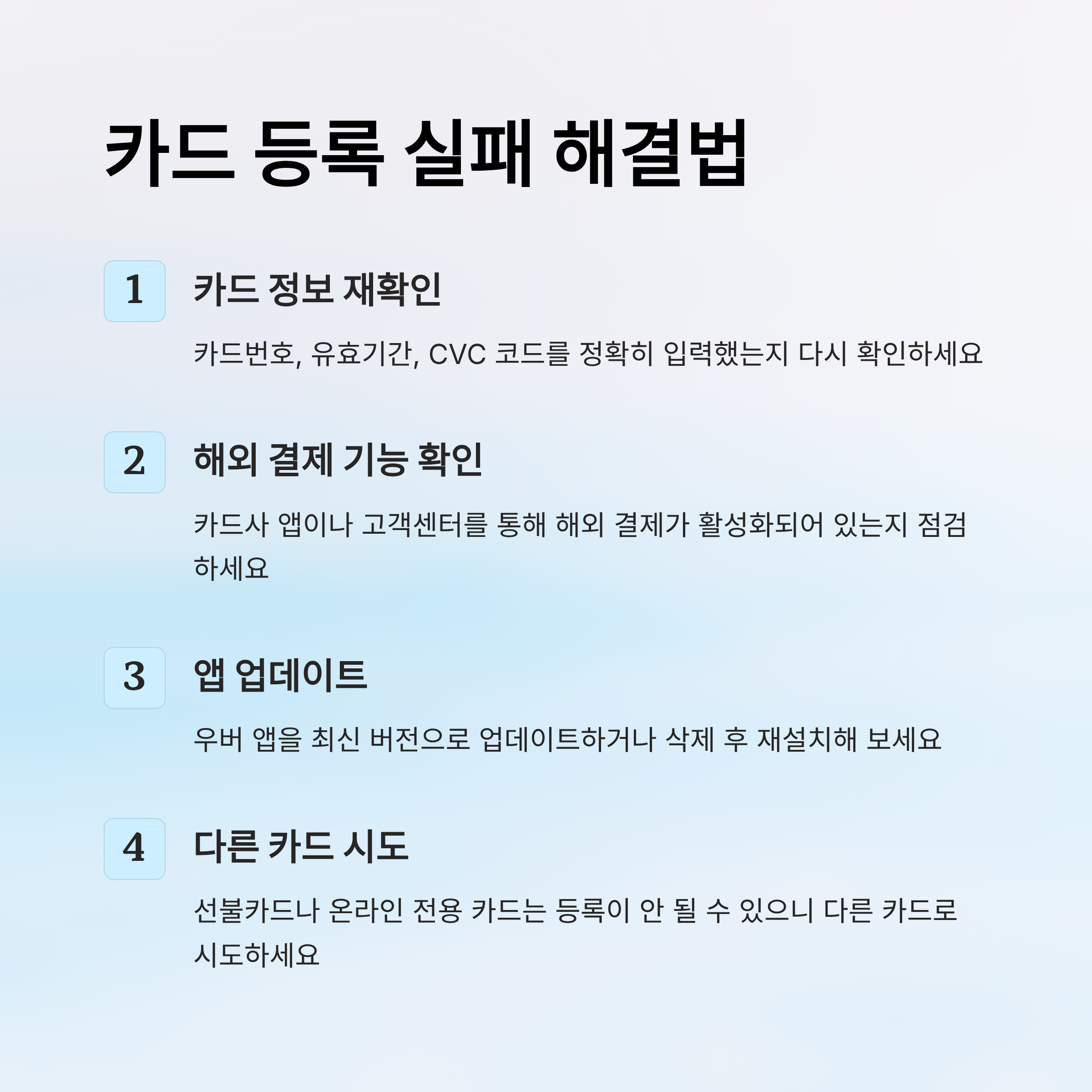 5️⃣ 우버 계정 국가가 카드 발급 국가와 다르면 등록 오류가 날 수 있어요. 이럴 땐 계정 국가를 변경하거나 해외용 카드 사용을 권장해요.