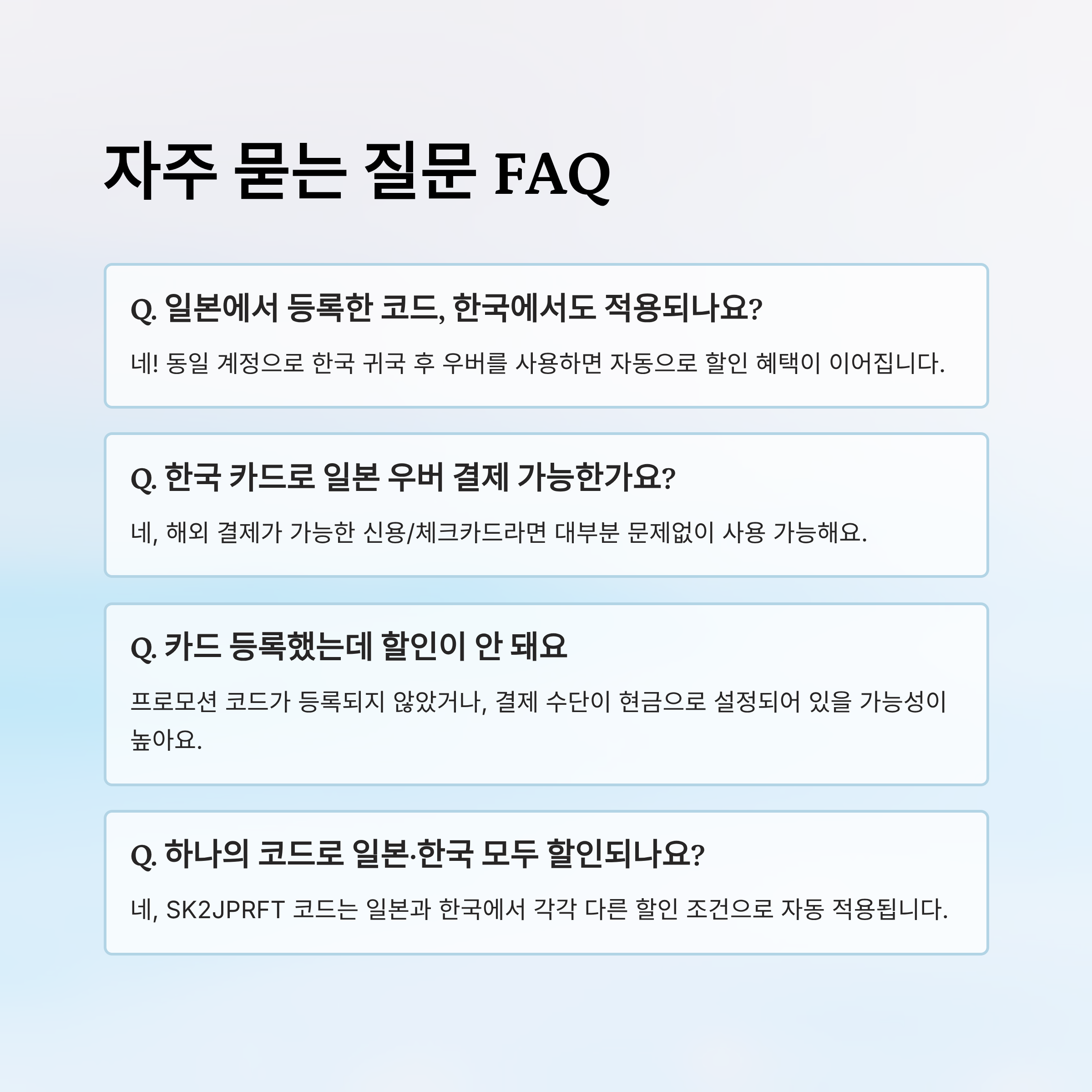 3️⃣ 현재 제공 중인 할인코드(SK2JPRFT 또는 25UBERJP 등)를 입력하고 확인을 누르면 자동 등록돼요.
