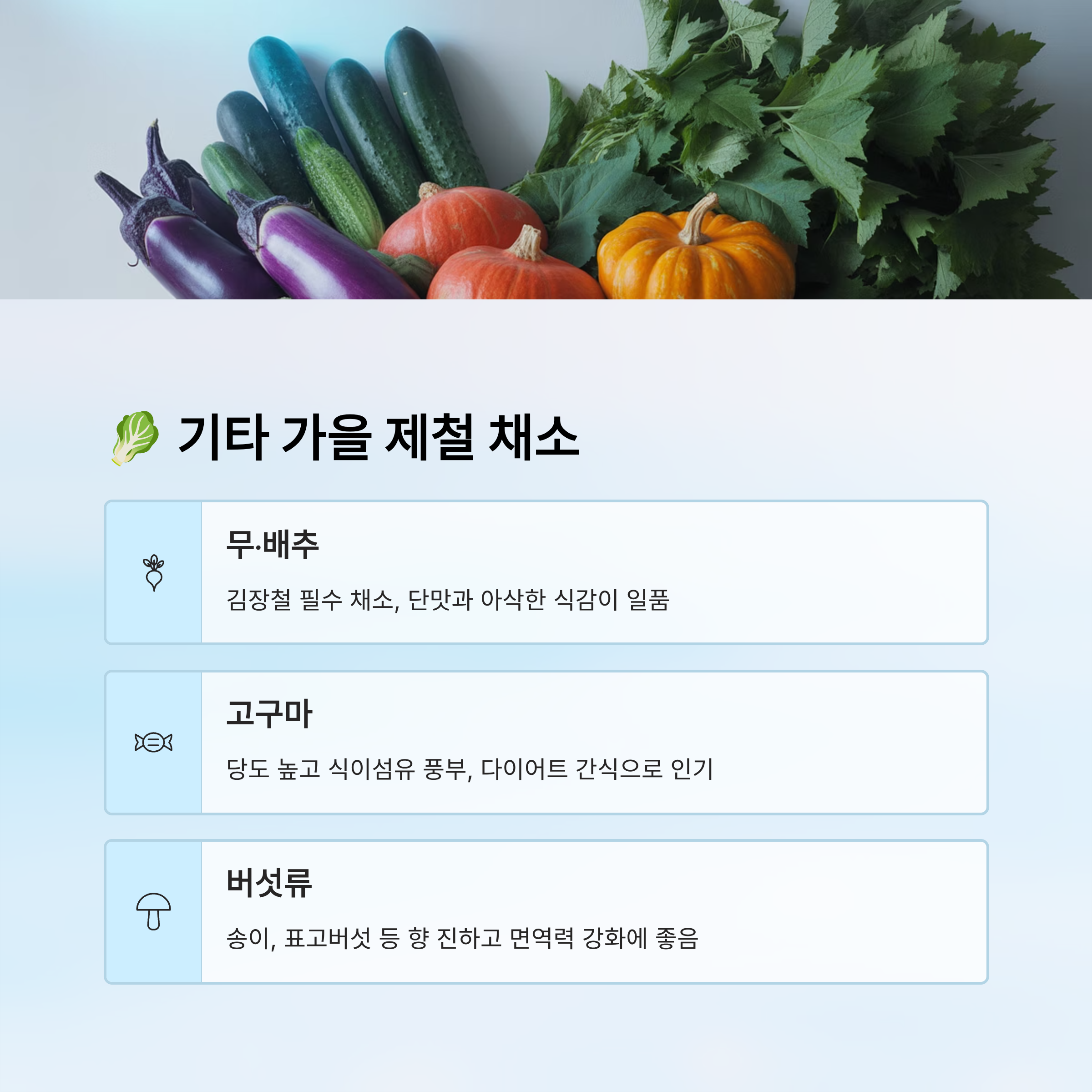 가을은 해산물과 과일뿐 아니라 채소도 풍성하게 수확되는 계절이에요. 9월에는 무, 배추, 시금치, 고구마, 버섯 같은 채소들이 제철을 맞아 영양과 맛이 최고조에 달하죠. 특히 날씨가 선선해지면서 채소들이 천천히 자라 당도가 높고 식감이 아삭아삭해져요. 그래서 가을 밥상은 언제나 신선하고 건강한 느낌을 줘요.