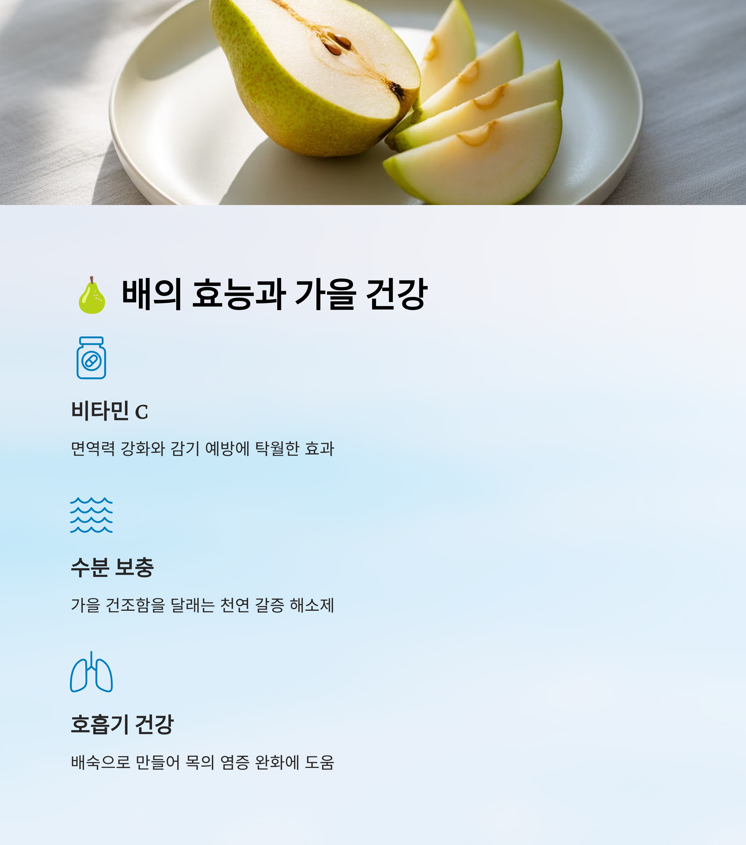 이처럼 배는 단순히 달콤한 과일이 아니라 가을 건강을 지켜주는 중요한 역할을 해요. 가을철에는 배를 자주 챙겨 먹으면서 계절의 맛과 건강을 동시에 누려보는 게 좋아요. 😄