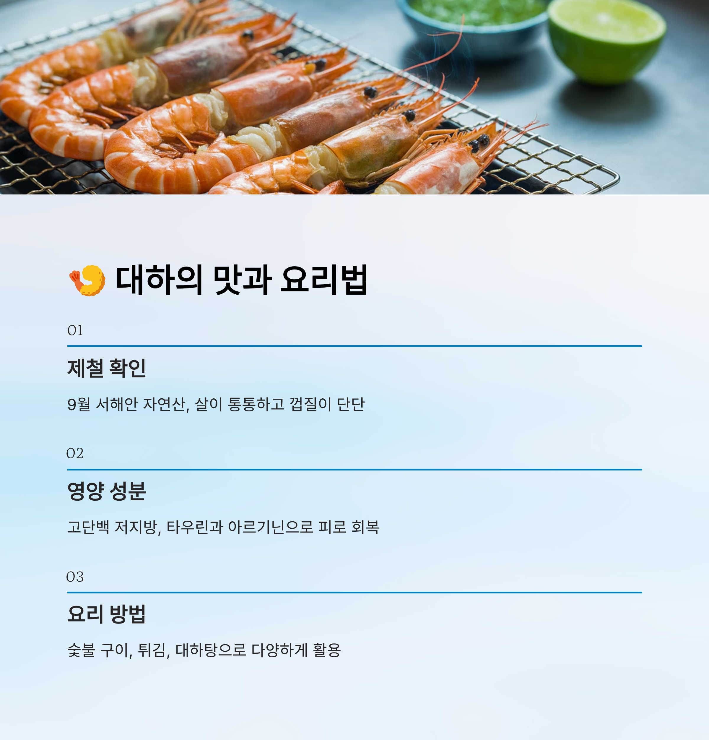 | 대하 | 9월~11월 | 크고 살이 통통 | 구이, 튀김, 탕 | 고소하고 담백 |