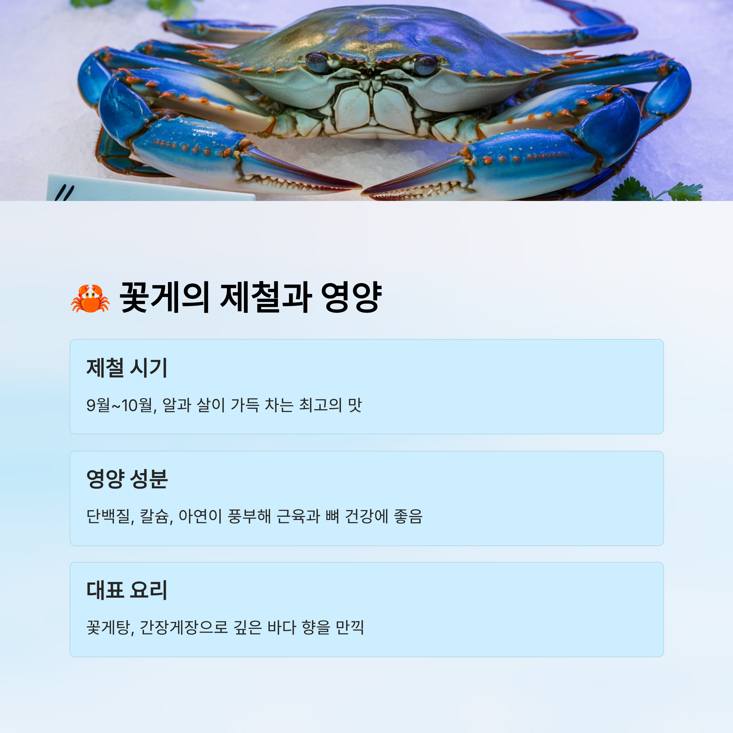 | 꽃게 | 9월~10월 | 단백질, 칼슘, 아연 | 꽃게탕, 게장 | 알과 살이 풍부 |