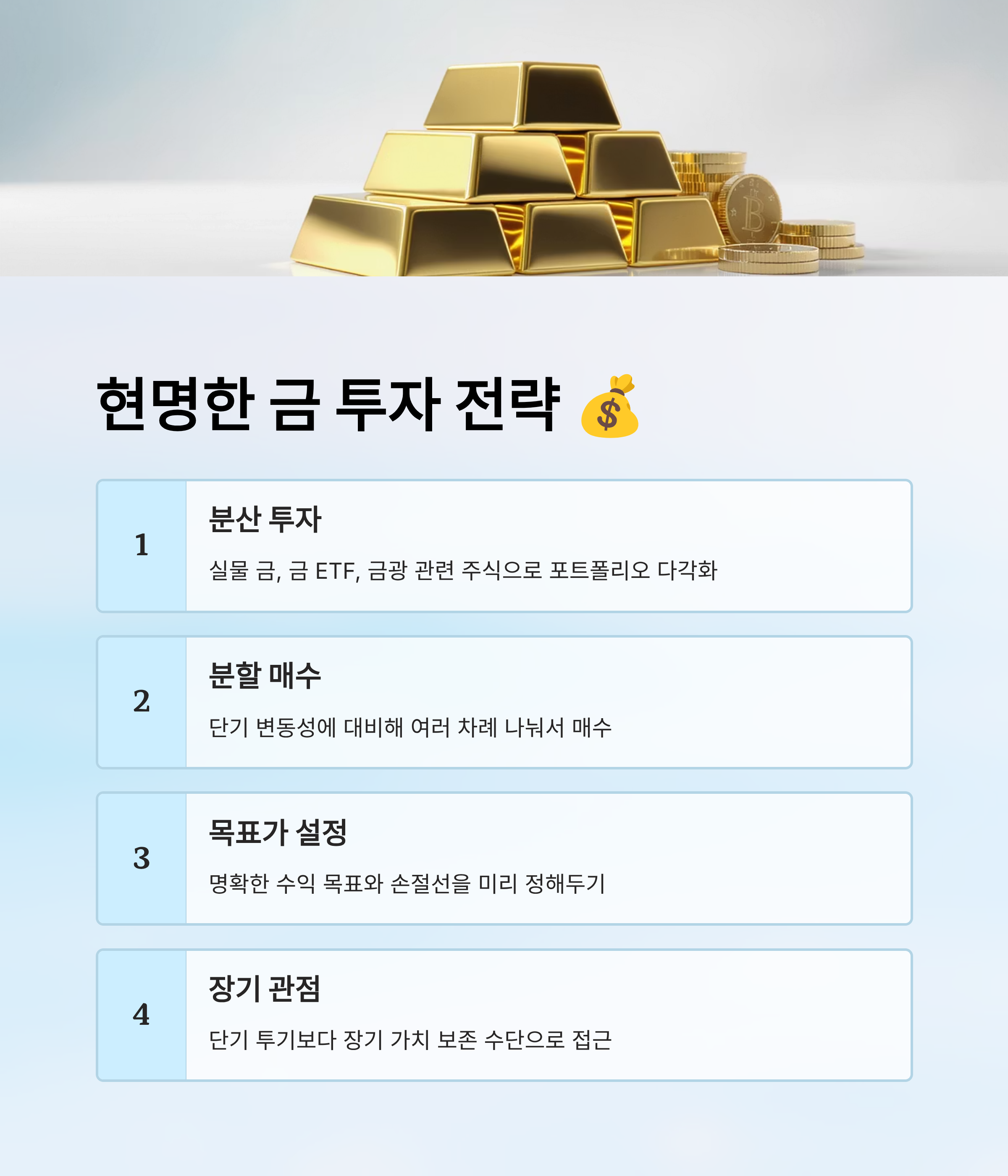 금 투자 전략으로는 실물 금보다는 금 ETF, 금 관련 주식(예: 금광회사), 장기 파생상품 등을 분산 투자하는 것이 유리할 수 있어요. 특히 단기 변동성에 휘둘리지 않으려면 분할 매수와 목표가 설정이 필수예요.