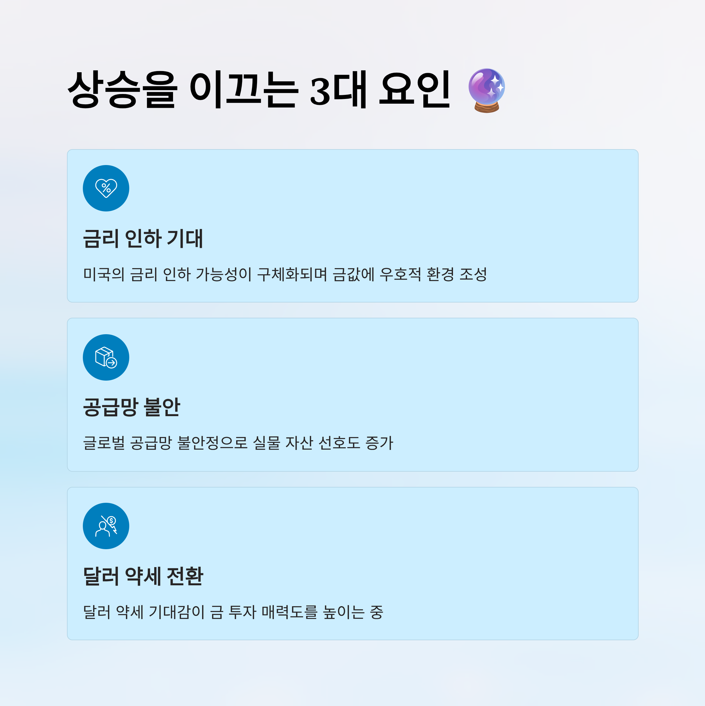 그 이유는 크게 세 가지예요. 첫째, 미국의 금리 인하 가능성이 점차 구체화되고 있고, 둘째는 글로벌 공급망 불안정, 셋째는 달러 약세 전환 기대감이에요. 이런 조건은 모두 금값에 우호적이에요.