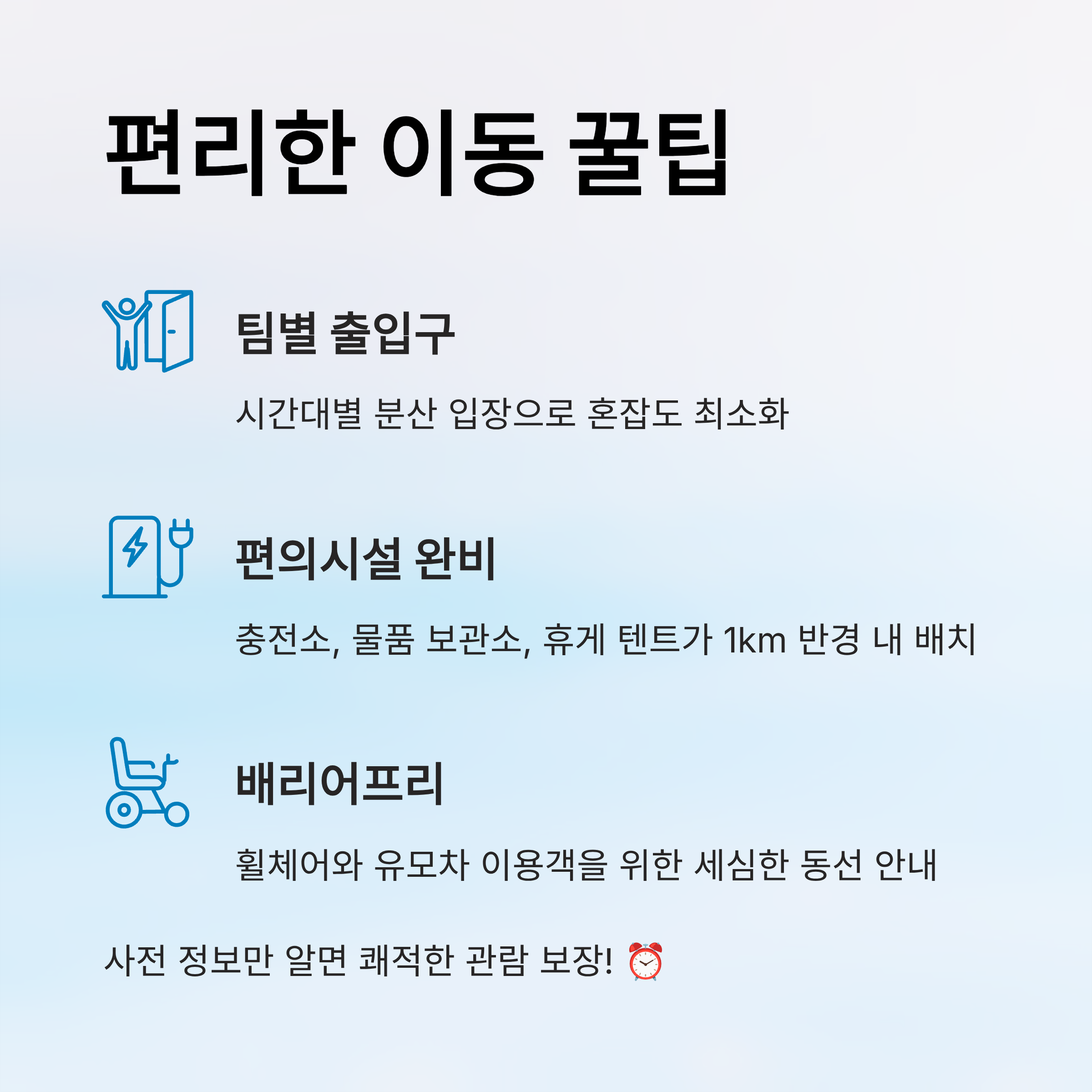 또한, 휠체어나 유모차를 사용하는 관람객을 위한 배리어프리 안내도 충실하게 준비되어 있어요. 특히 입장로와 화장실 주변엔 바닥에 노란선 안내가 잘 되어 있어서 누구나 쉽게 이동 가능하답니다. 정말 세심한 배려가 느껴졌어요.