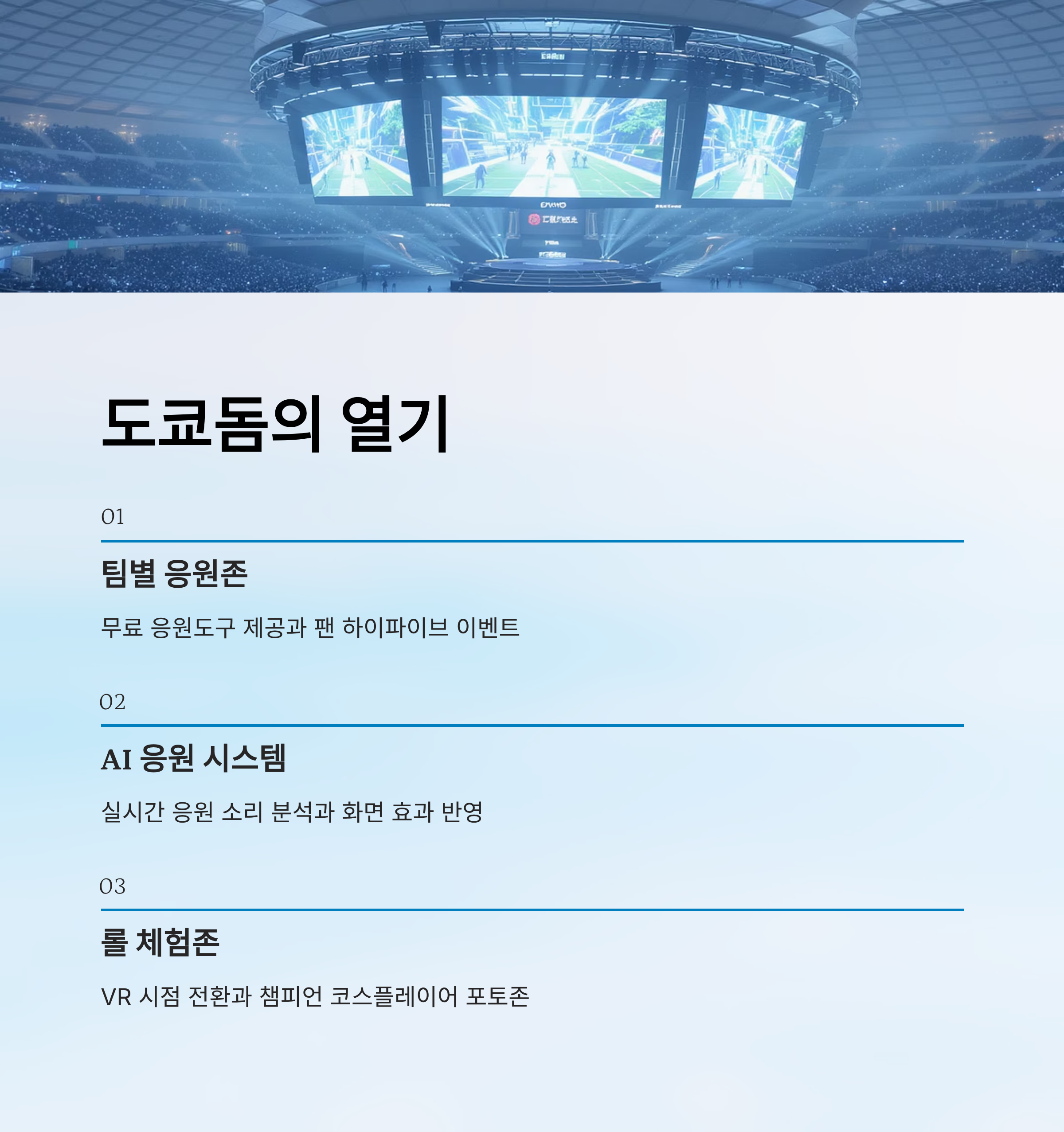 | AR 응원 시스템 | 실시간 반응 효과 | 전 관람객 | 몰입감 극대화 | 무료 |