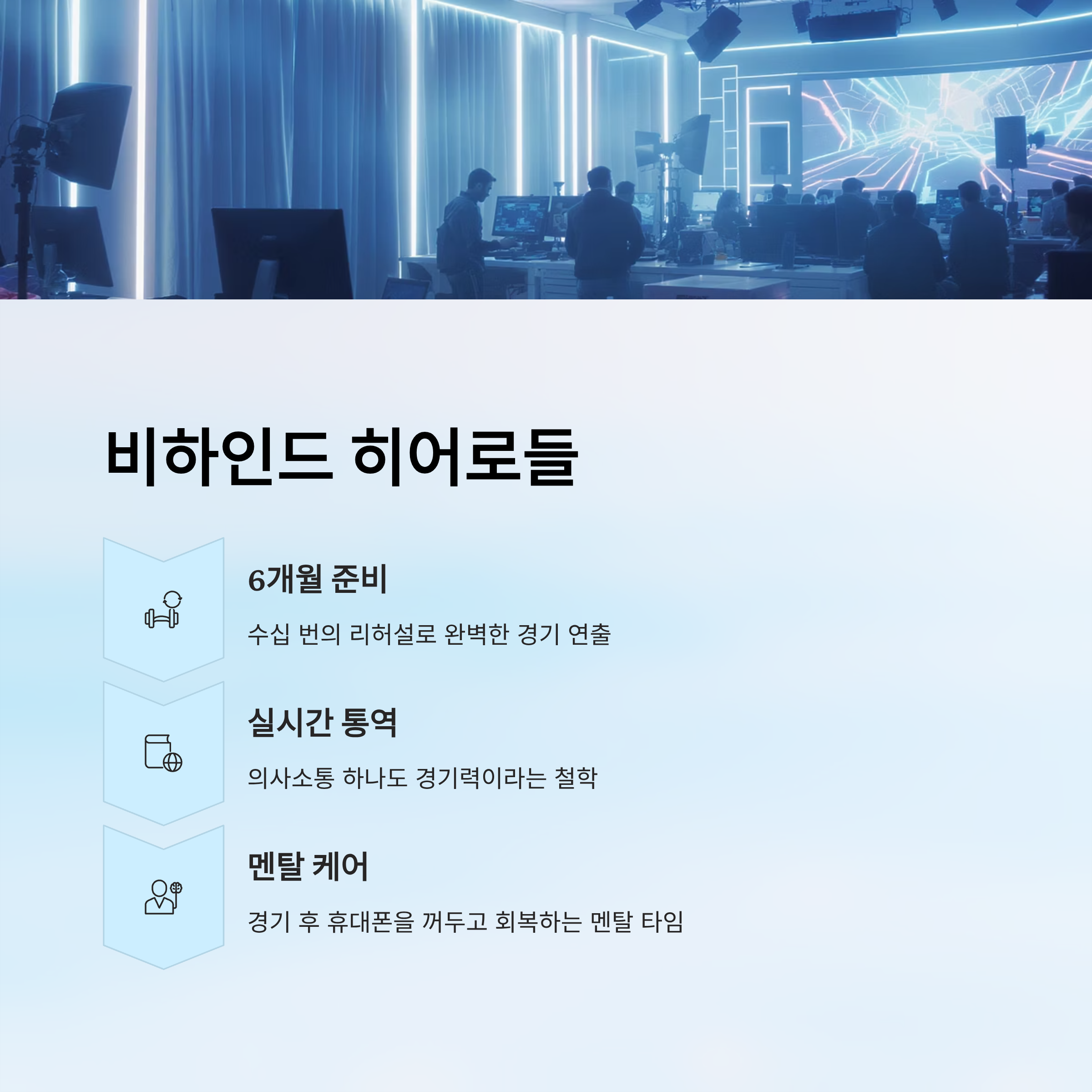 롤드컵 현장은 겉으로 보이는 화려함 이면에 정말 수많은 사람들이 움직이고 있어요. 경기 한 경기를 위해 수십 명의 운영팀, 통역가, 방송 스태프들이 분 단위로 움직이며 정확한 흐름을 조율하고 있어요. 마치 잘 짜인 연극 같다고 할까요? 🎭