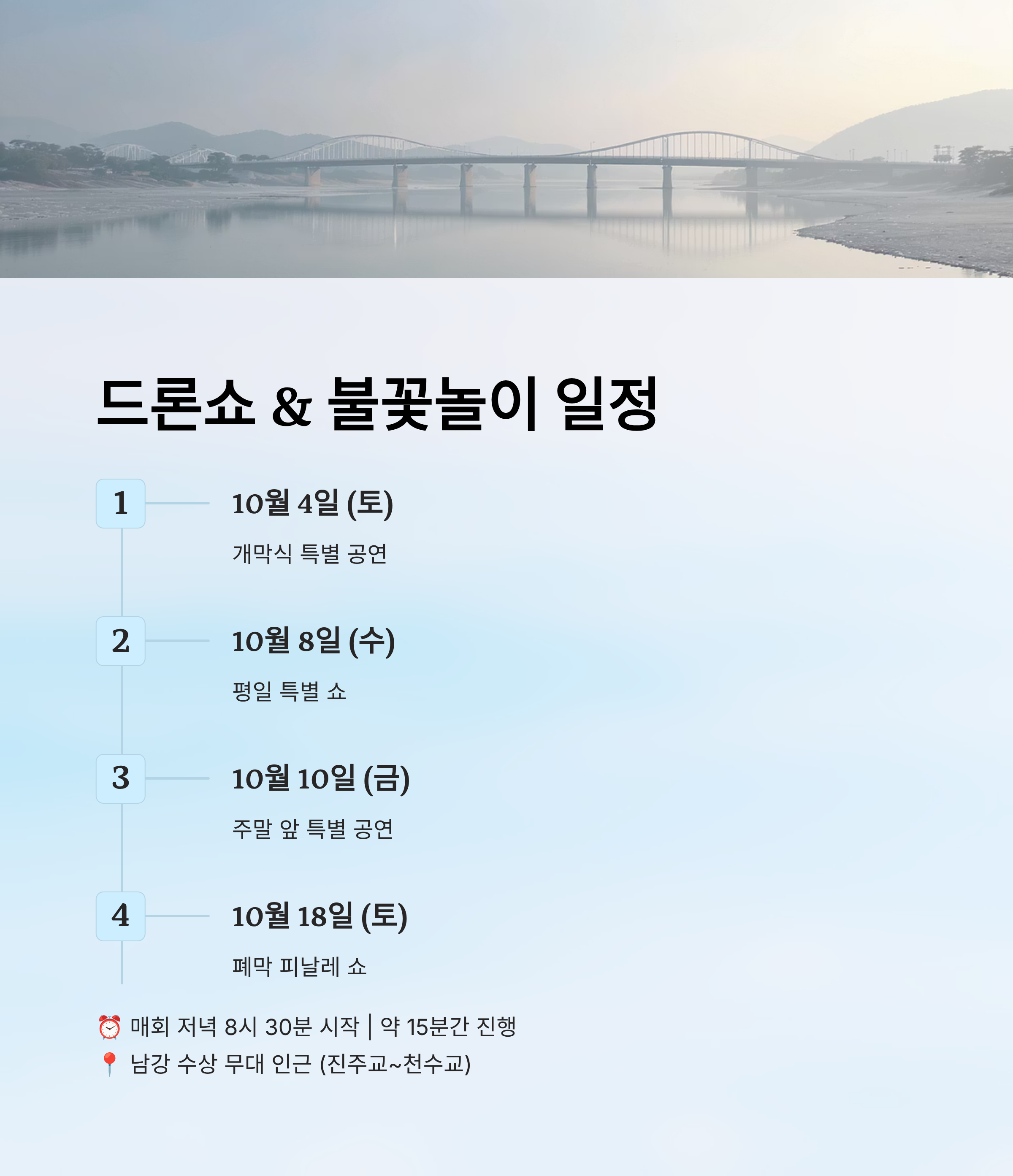 A2. 드론쇼와 불꽃놀이는 10월 4일, 8일, 10일, 18일 밤 8시 30분에 열려요. 장소는 남강 수상무대 인근이에요.