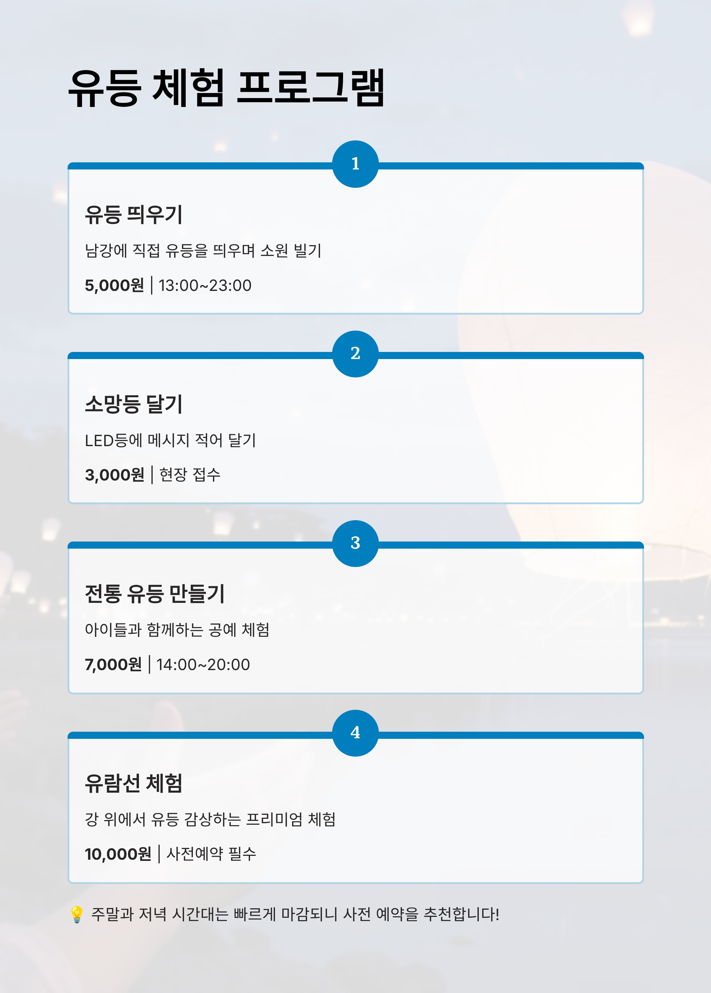 소망등 달기 | 등에 소원 적기 | 13:00~23:00 | 3,000원 | 현장만 |