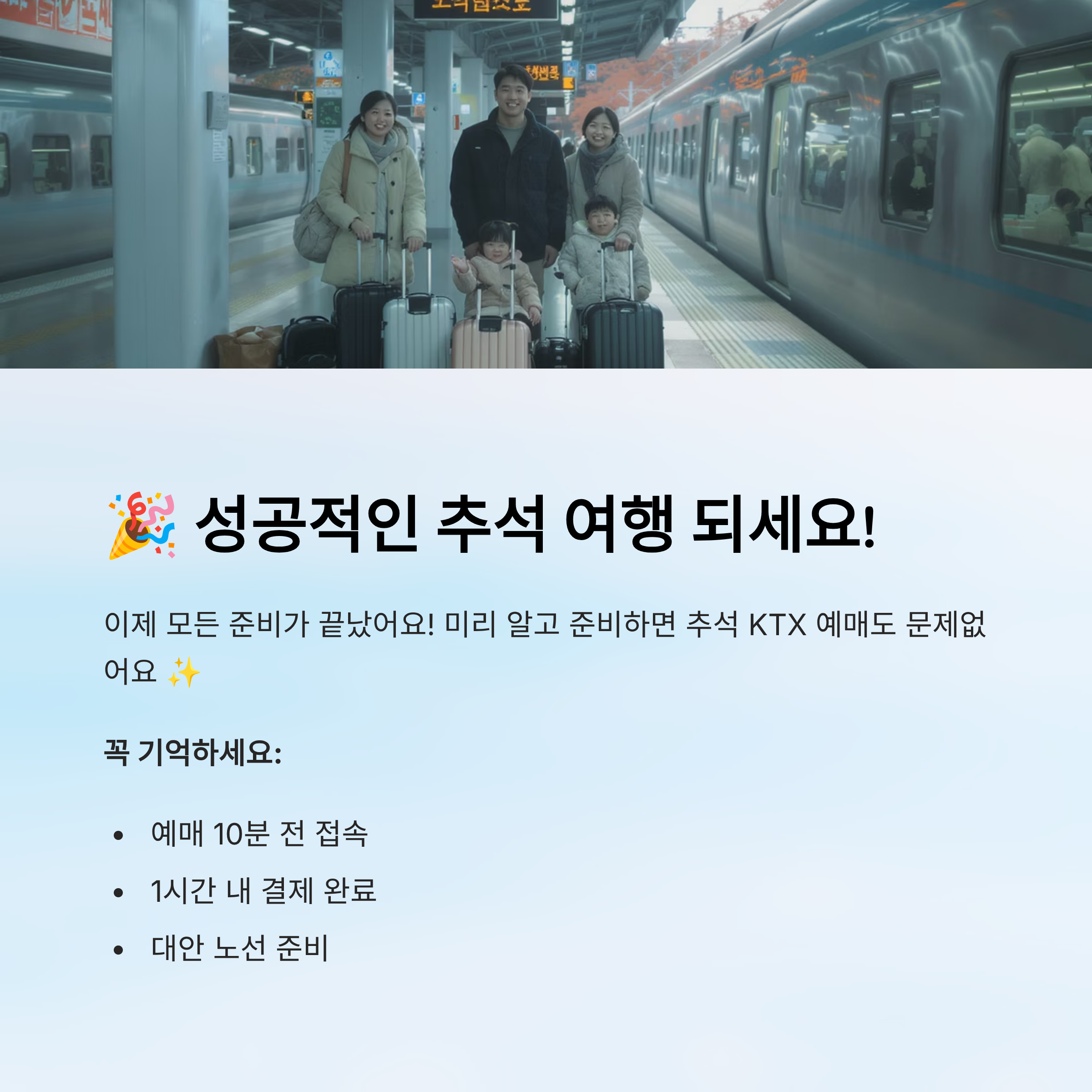 추석 KTX 예매는 정말 치열한 전쟁이에요. 서버는 마비되고, 클릭 한 번이 승부를 가르죠. 하지만 알고 준비하면, 생각보다 훨씬 쉽게 성공할 수 있어요. 여기서 공유하는 전략들은 실전 경험을 바탕으로 정리한 것들이니 꼭 참고해보세요!